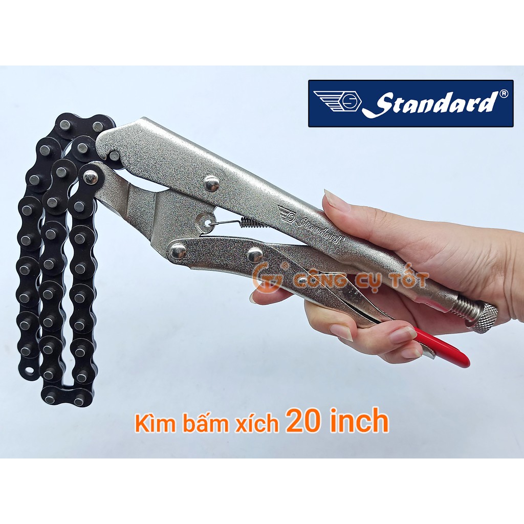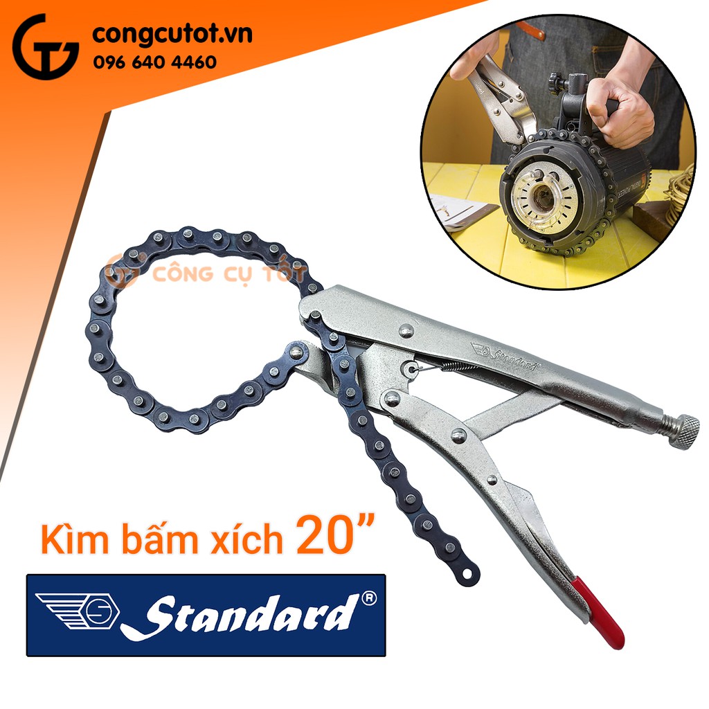 Kìm bấm chết dây xích Standard 20 inch được chế tạo từ thép hợp kim mạ Crom đã qua xử lý nhiệt tổng thể nên có "tuổi thọ cao", độ cứng ổn định, không bị biến dạng trong quá trình sử dụng. Đây là dụng cụ cầm tay chuyên dụng dùng để tháo mở hoặc vặn siết các đường ống có kích cỡ khác nhau, đặc biệt là các loại ống có đường kính lớn. Kìm dây xích Standard 20" ứng dụng trong sửa chữa ô tô, máy móc nông nghiệp, công trình gia dụng, thiết bị điện tử, ngành công nghiệp, cơ khí...Làm từ thép hợp kim mạ Crom có độ bền cao, chịu lực và chịu nhiệt tốt, không bị biến dạng
