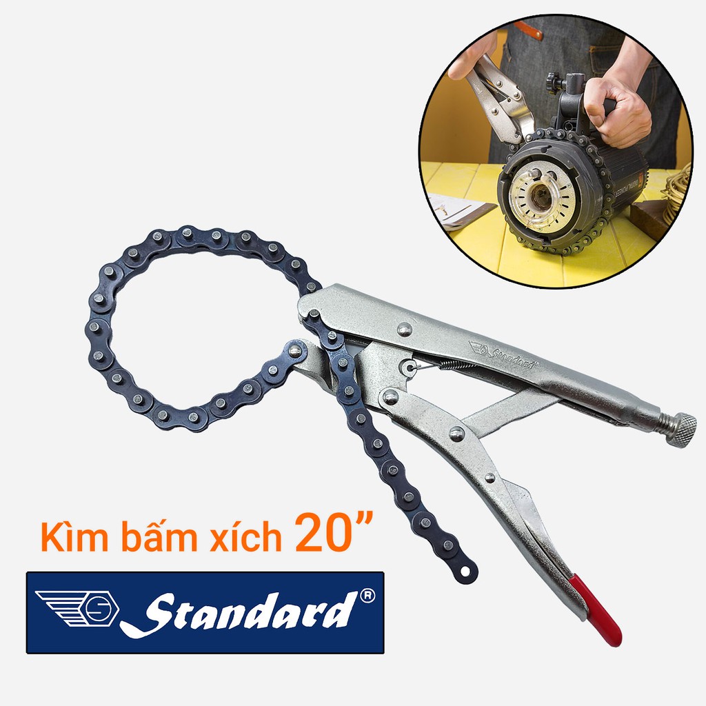 Kìm bấm chết dây xích Standard 20 inch được chế tạo từ thép hợp kim mạ Crom đã qua xử lý nhiệt tổng thể nên có "tuổi thọ cao", độ cứng ổn định, không bị biến dạng trong quá trình sử dụng. Đây là dụng cụ cầm tay chuyên dụng dùng để tháo mở hoặc vặn siết các đường ống có kích cỡ khác nhau, đặc biệt là các loại ống có đường kính lớn. Kìm dây xích Standard 20" ứng dụng trong sửa chữa ô tô, máy móc nông nghiệp, công trình gia dụng, thiết bị điện tử, ngành công nghiệp, cơ khí...Làm từ thép hợp kim mạ Crom có độ bền cao, chịu lực và chịu nhiệt tốt, không bị biến dạng