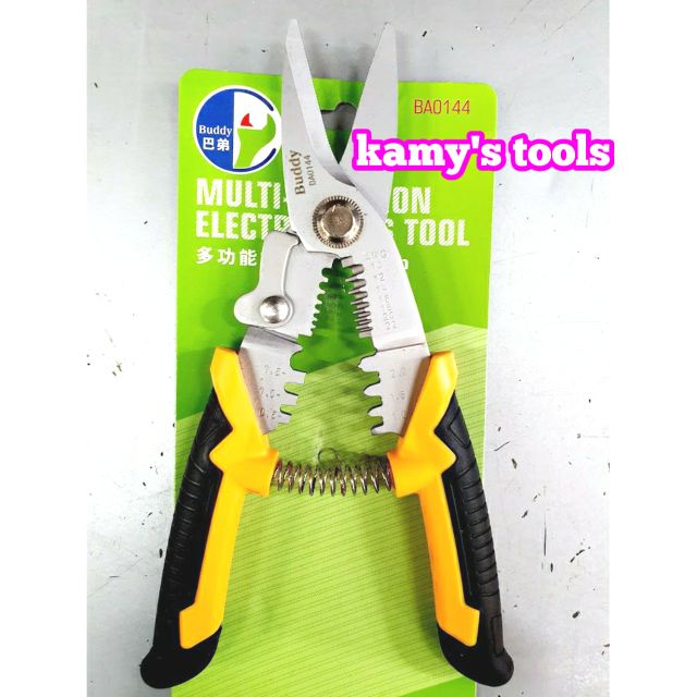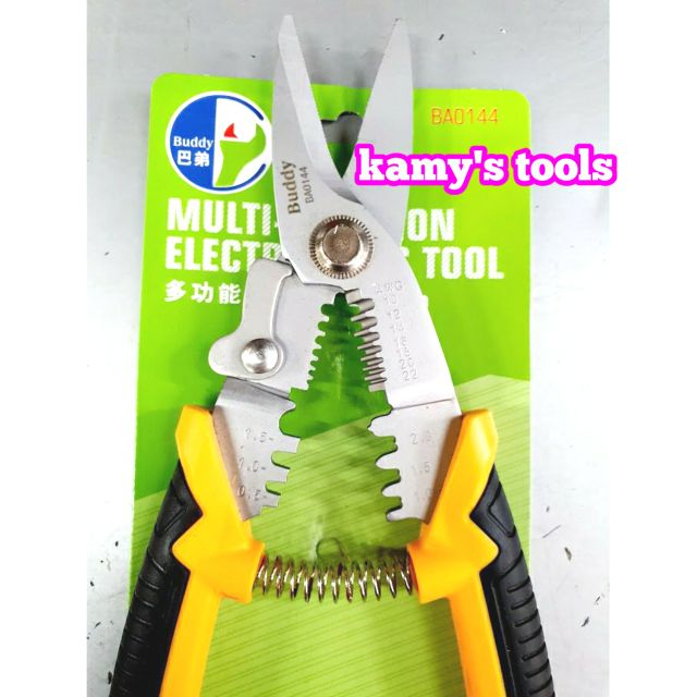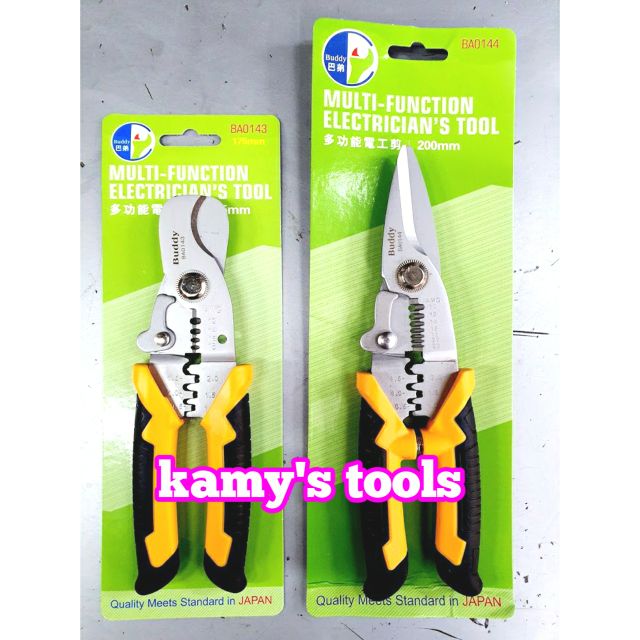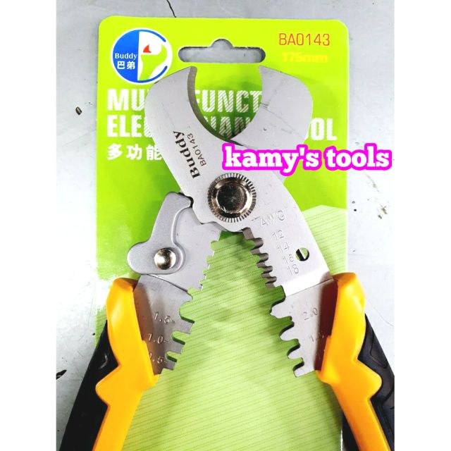 Kamy’s tools chuyên phân phối các loại kìm cắt dây đa năng là một loại dụng cụ cầm tay chuyên dụng được thiết kế có thể sử dụng cùng lúc 3 chức năng là cắt dây điện, tuốt dây điện và bấm cos. Trong đó Kìm cắt dây đa năng 3 trong 1 buddy BA0143 và BA0144 là một trong những sản phẩm được bán chạy nhất với thương hiệu buddy nổi tiếng chuyên sản xuất các loại cụ cầm tay có chất lượng tốt trên thị trường. Kìm cắt dây đa năng 3 trong 1 buddy BA0143 và BA0144 là 2 model kìm cắt dây đa năng của buddy đều có 3 chức năng cắt dây, tuốt dây và bấm cos, chỉ khác nhau ở chỗ:Kìm cắt dây đa năng 3 trong 1 buddy BA0143 có chiều dài 175mm có thể cắt được các loại dây cáp điện có đường kính từ 16mm trở lại, tương đương 4 sợi 6mm2 trở lại. Kìm cắt dây đa năng 3 trong 1 buddy BA0143 có thể tuốt được các loại dây điện đường kính từ 1mm2-4.0mm2 tương đương từ AWG18-12. Ngoài ra Kìm cắt dây đa năng 3 trong 1 buddy BA0143 còn có thể bấm được các loại đầu cos điện từ 0.5-2.0mm2.