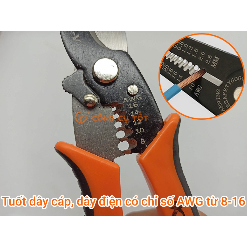 Có thể tuốt nhiều kích cỡ dây theo tiêu chuẩn AWG từ 16, 14, 12, 10 và 8