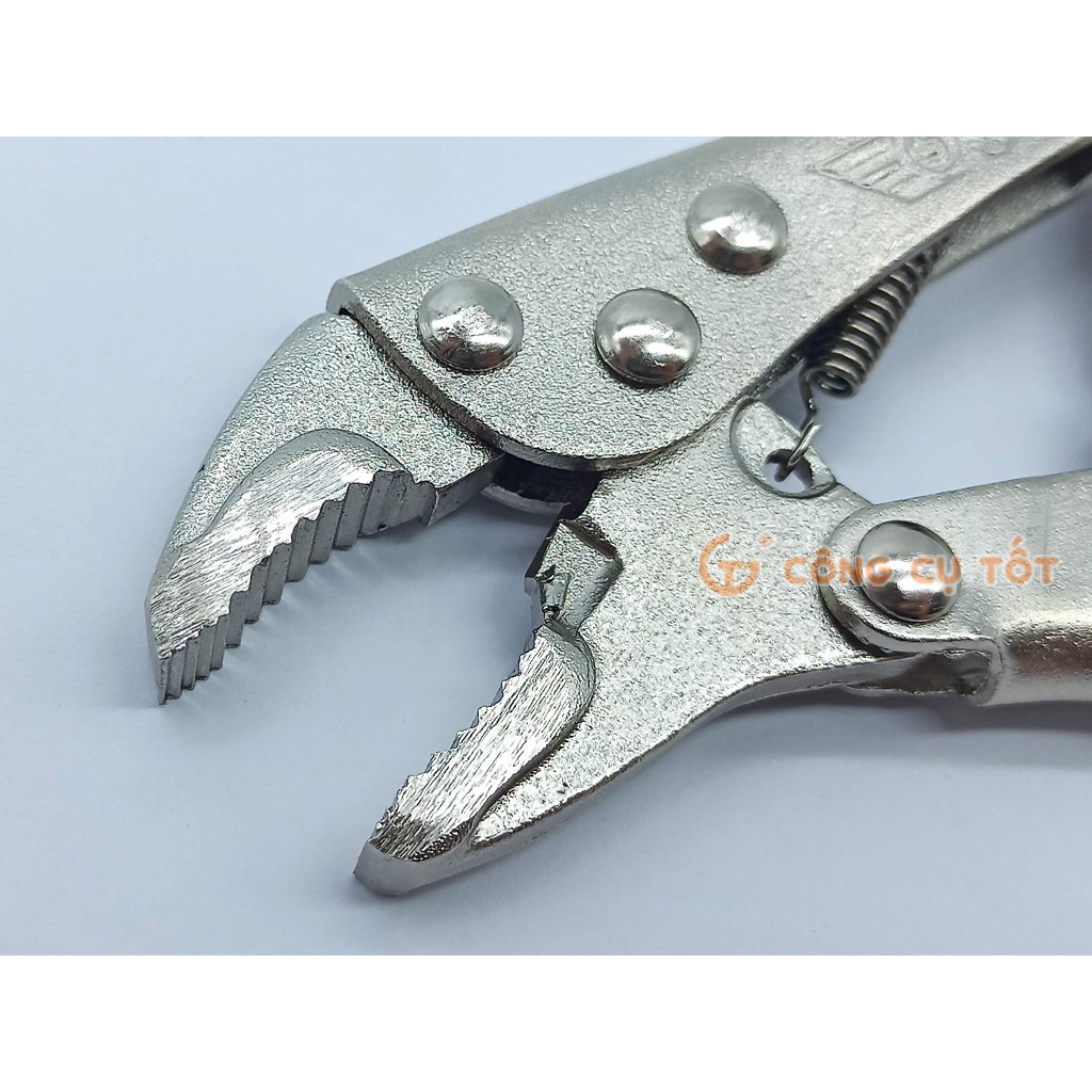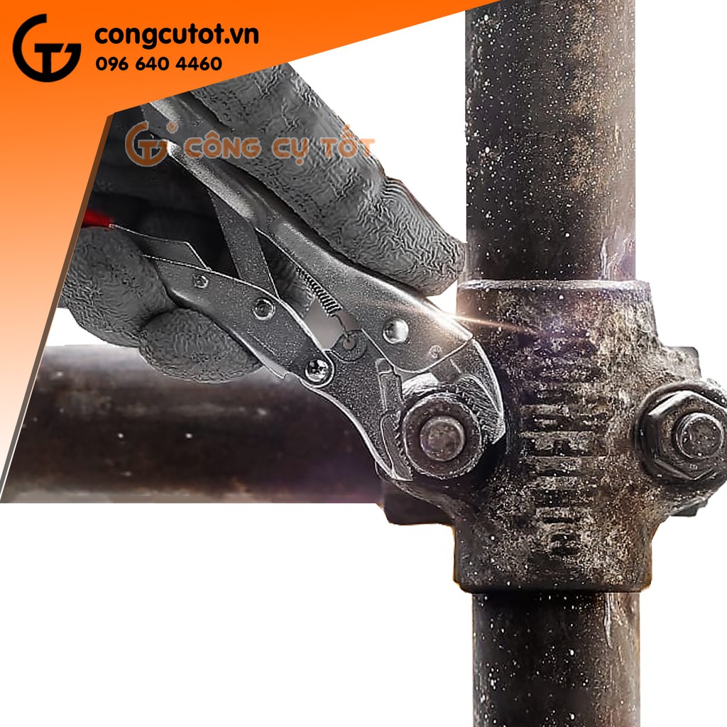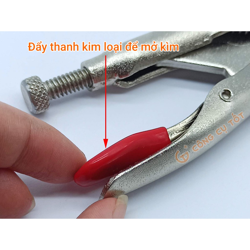 Bước 4: Dùng 2 tay bóp chặt thân kìm lại cho tới khi lẫy khóa bật lên để cố định ngàm kẹp và tiến hành thao tác kẹp giữ hoặc vặn tháo các chi tiết.