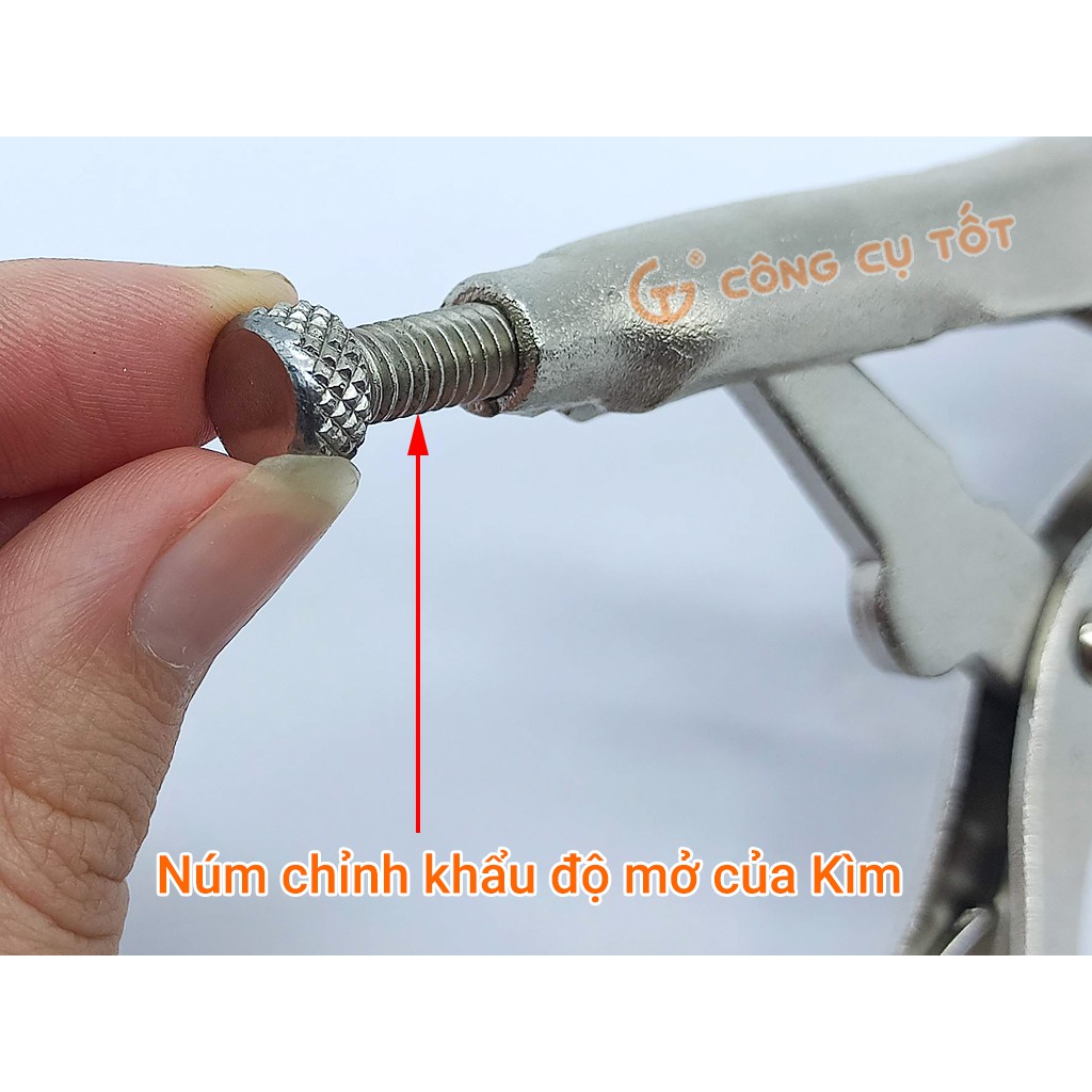 Bước 3: Vặn vít tròn bên dưới cán cầm để điều chỉnh độ mở của ngàm sao cho ngàm kẹp ôm khít lấy chi tiết cần thao tác.