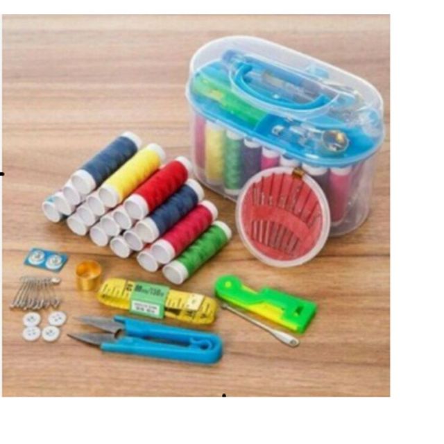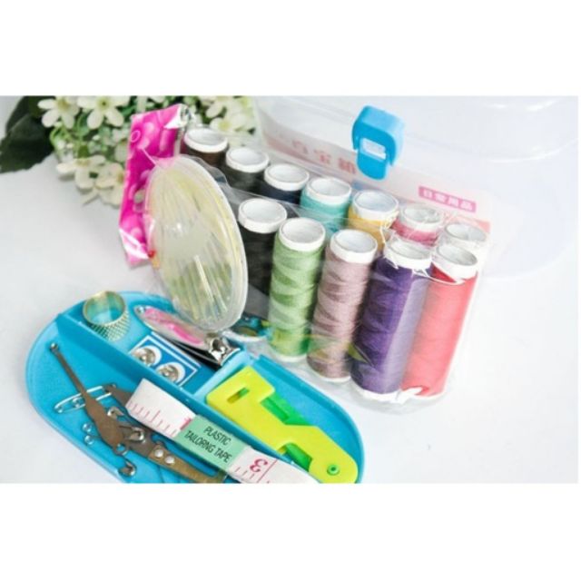 Bộ sản phẩm bao gồm : các cuộn chỉ các màu, 01 hộp kim các loại (), 01 kéo cắt chỉ, 01 thước dây, 01 dụng cụ xỏ chỉ, 10 kim băng, 02 cúc bấm, 01 bấm móng tay, 01 dụng cụ lấy ráy tai, 01 nhẫn ấn kim