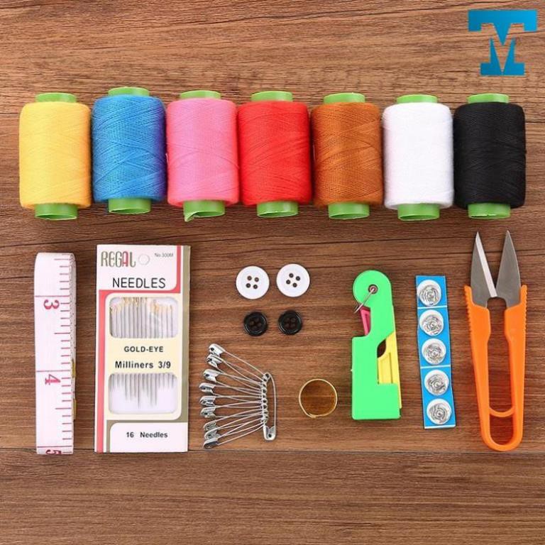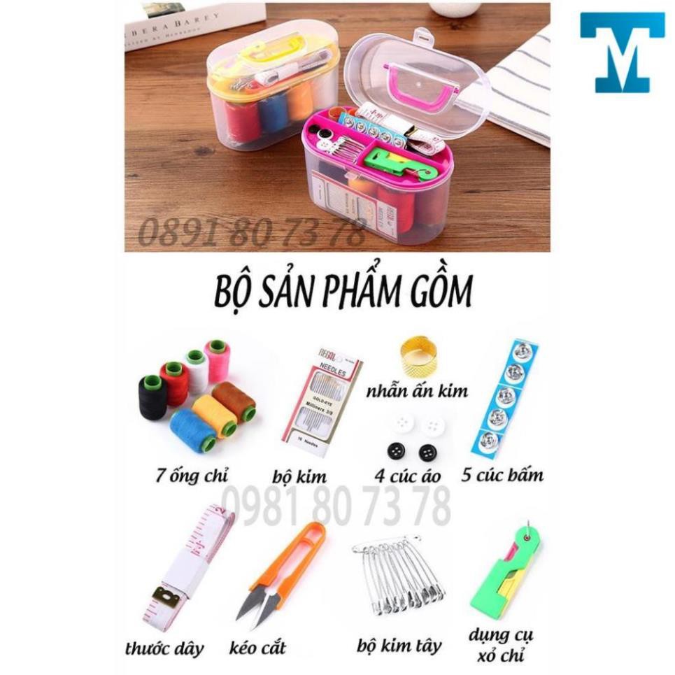 Hộp sản phẩm bao gồm: 7 ống chỉ, bộ kim khâu, cúc bấm, thước dây, kéo cắt chỉ, dụng cụ xỏ kim, nhẫn ấn kim, 10 kim tây, cúc áo, hộp đựng.