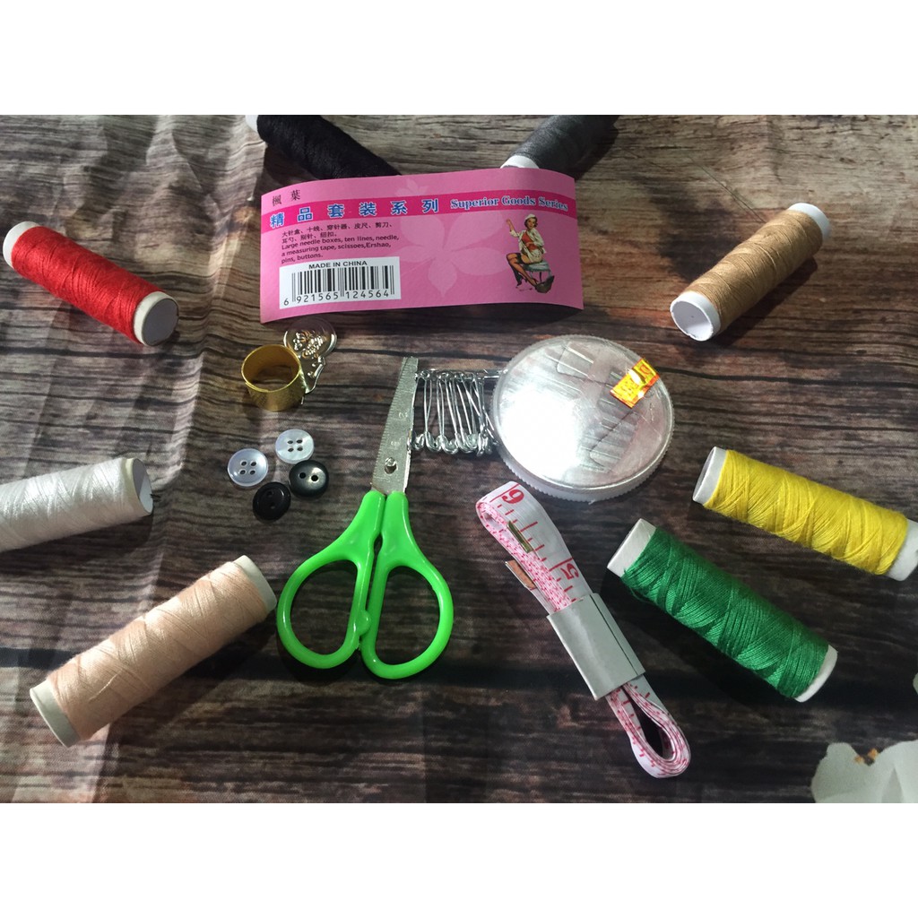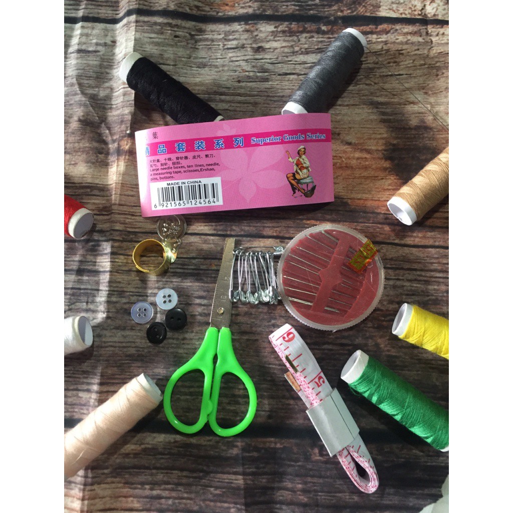 Bộ sản phẩm bao gồm : các cuộn chỉ các màu, 01 hộp kim các loại (), 01 kéo cắt chỉ, 01 thước dây, 01 dụng cụ xỏ chỉ, 10 kim băng, 02 cúc bấm, 01 bấm móng tay, 01 dụng cụ lấy ráy tai, 01 nhẫn ấn kim