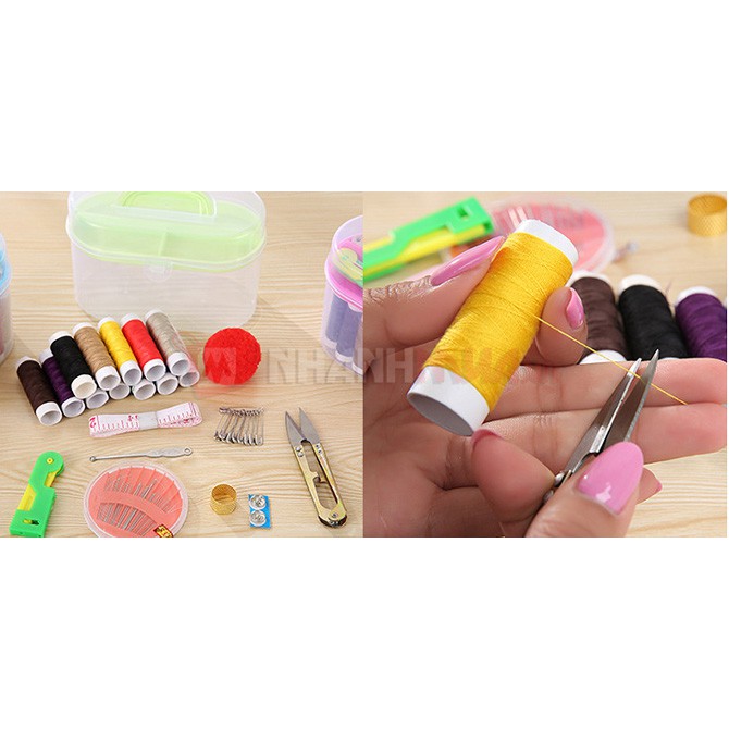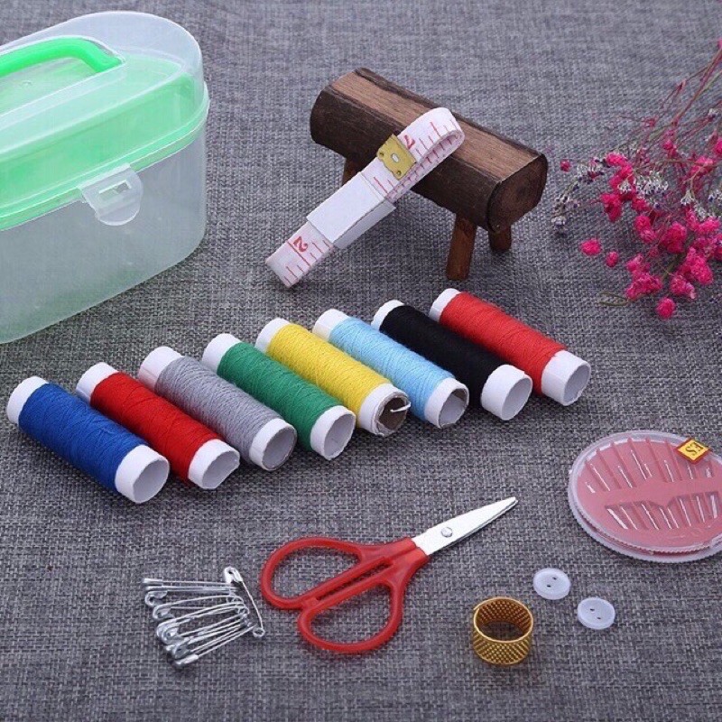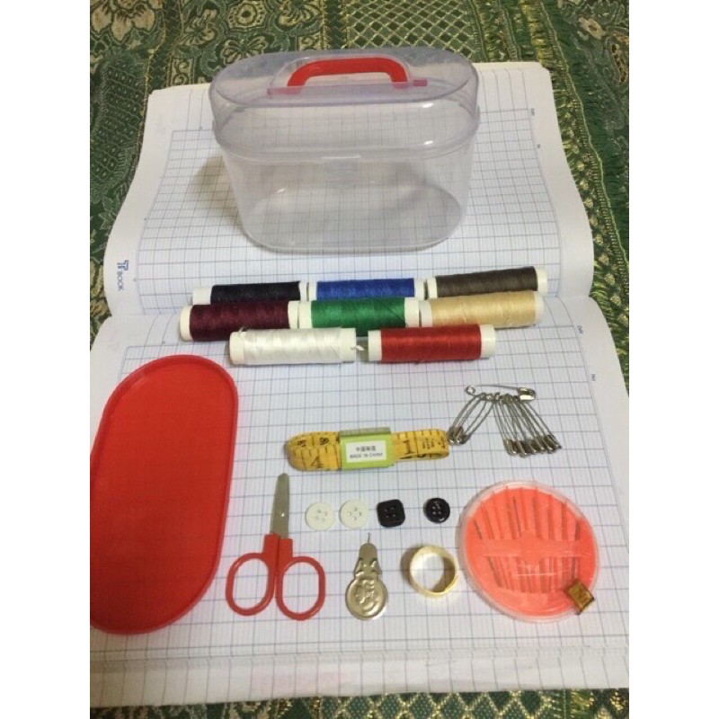 - Bao gồm: cuộn chỉ các màu, kim các loại, kéo cắt chỉ, thước dây, dụng cụ xỏ chỉ, kim băng, cúc bấm, , nhẫn ấn kim, hộp nhựa,