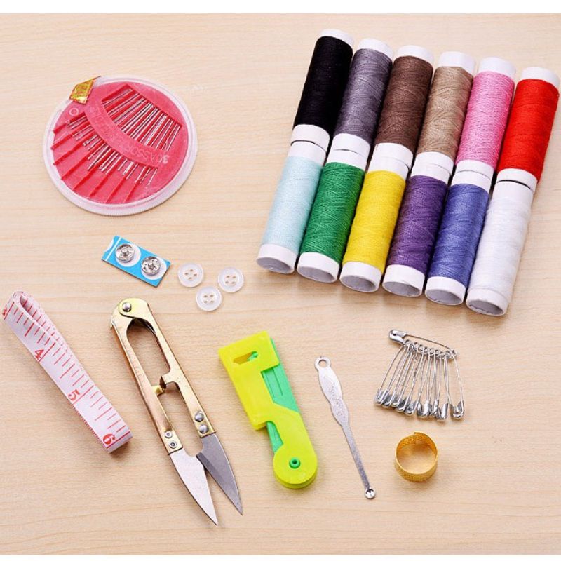 Hộp sản phẩm bao gồm: 10 cuộn chỉ các màu, 1 hộp kim các loại, 1 kéo cắt chỉ, 1 thước dây, 1 dụng cụ xỏ chỉ, 6 cúc bấm, 1 dụng cụ bảo vệ ngón tay, 4 cúc nhỏ.