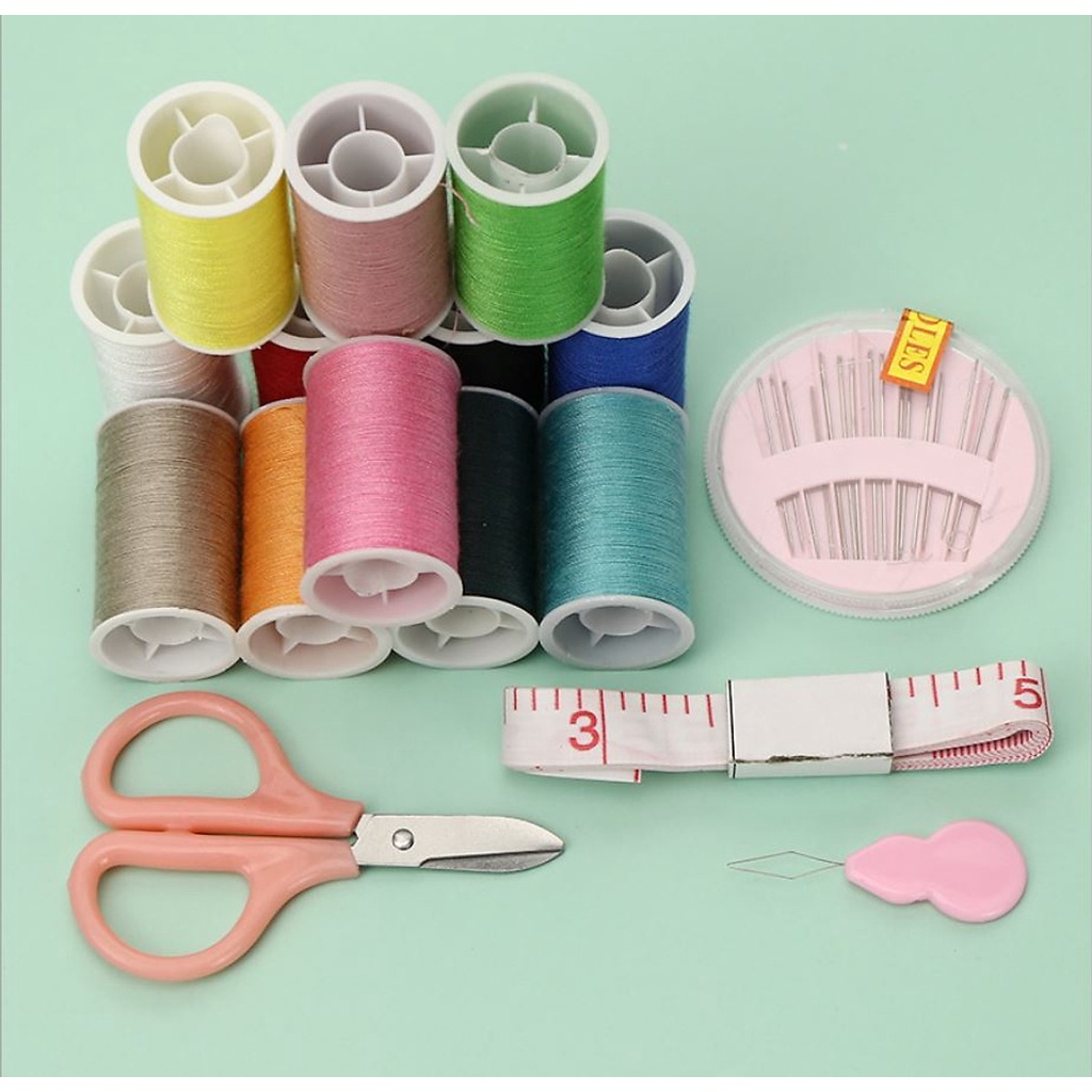 - Bộ Sản Phẩm Gồm: Một hộp sản phẩm gồm 12 cuộn chỉ các màu, 1 hộp gồm 24 chiếc kim các loại, 01 kéo cắt chỉ, 01 thước dây, 01 dụng cụ xỏ chỉ.