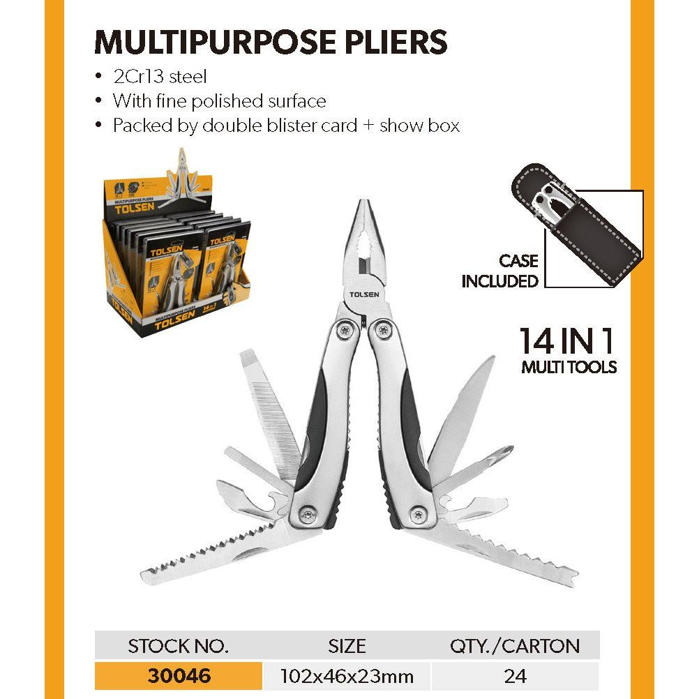 Kìm đa năng 14 in 1 Tolsen 30046Kìm đa năng tolsen mã số 30046 14 món đa dụng có thể gấp lại gọn nhẹ dể bỏ túi khi đi du lịch và đi phượt có thể mở vít , cưa , dũa , khui đồ hộp vv....