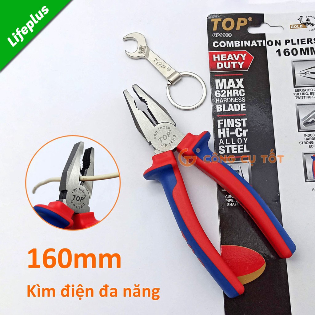 Kìm điện cao cấp TopGold 160mm lưỡi thép giàu Crôm tôi cao tần độ cứng HRC62 được làm từ thép Chrome Vanadium không gỉ, độ bền cao, độ cứng ổn định. Đây là dụng cụ cầm tay hữu dụng dành cho những người thợ điện, thợ sửa chữa cơ khí, người làm trang sức, đồ thủ công mỹ nghệ. sản phẩm ứng dụng hiệu quả trong việc kẹp, giữ và vặn các chi tiết bằng kim loại, cắt được dây thép ~2.5mm, dây cáp điện, cáp quang, dây kẽm…Chuyển cắt, kẹp, gắp dây thép cứng 2mm, thép khá cứng 3.1mm, dây đồng 4mm.