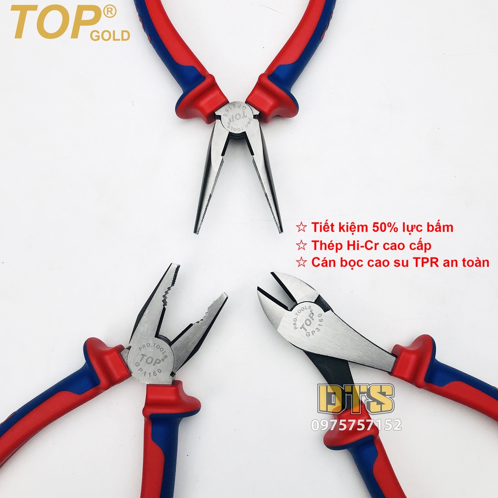 Kìm điện - cắt - nhọn trợ lực chuyên nghiệp 160mm TOP GOLD, thép Hi-Cr cao cấp, thiết kế cộng lực tiết kiệm 50% lực bấm