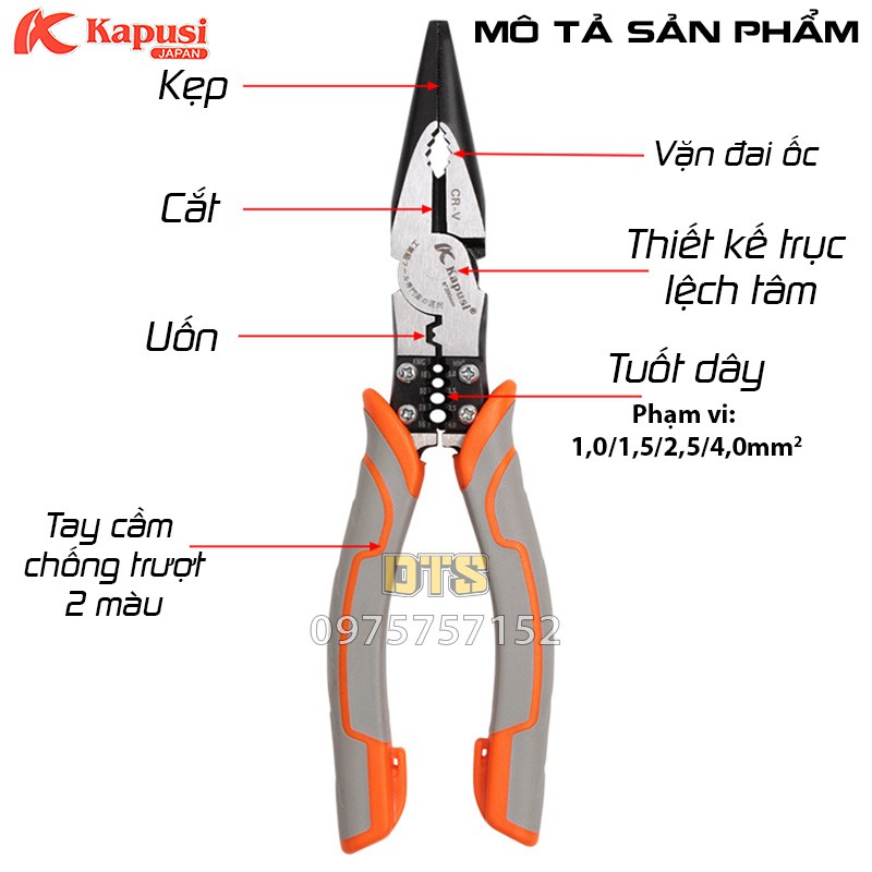 Kìm điện – kìm cắt - nhọn kìm đa năng công nghiệp Nhật Kapusi JAPAN thép CR-V cao cấp, thiết kế tiên tiến tiết kiệm 30%