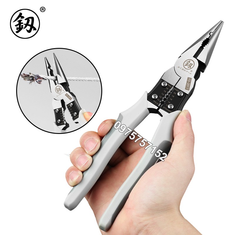 Kìm điện, kìm nhọn, kìm đa năng cao cấp Nhật Bản 5 trong 1 FUKOUKA 8inch/220mm (Kẹp-Cắt-Uốn-Cuộn-Tuốt dây)