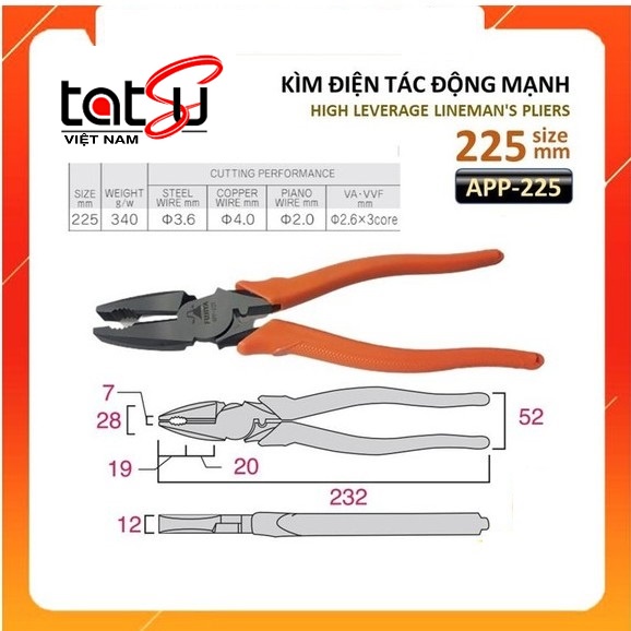 Kìm điện Fujiya APP-225 rất linh hoạt thao ở các vị trí khác nhau kể cả những nơi sâu, nhỏ hẹp. Kìm điện tác động mạnh là một dụng cụ cầm tay thông dụng và cần thiết được sử dụng phổ biến trong ngành công nghiệp, cơ khí, chế tạo, sửa chữa và lắp ráp thiết bị.