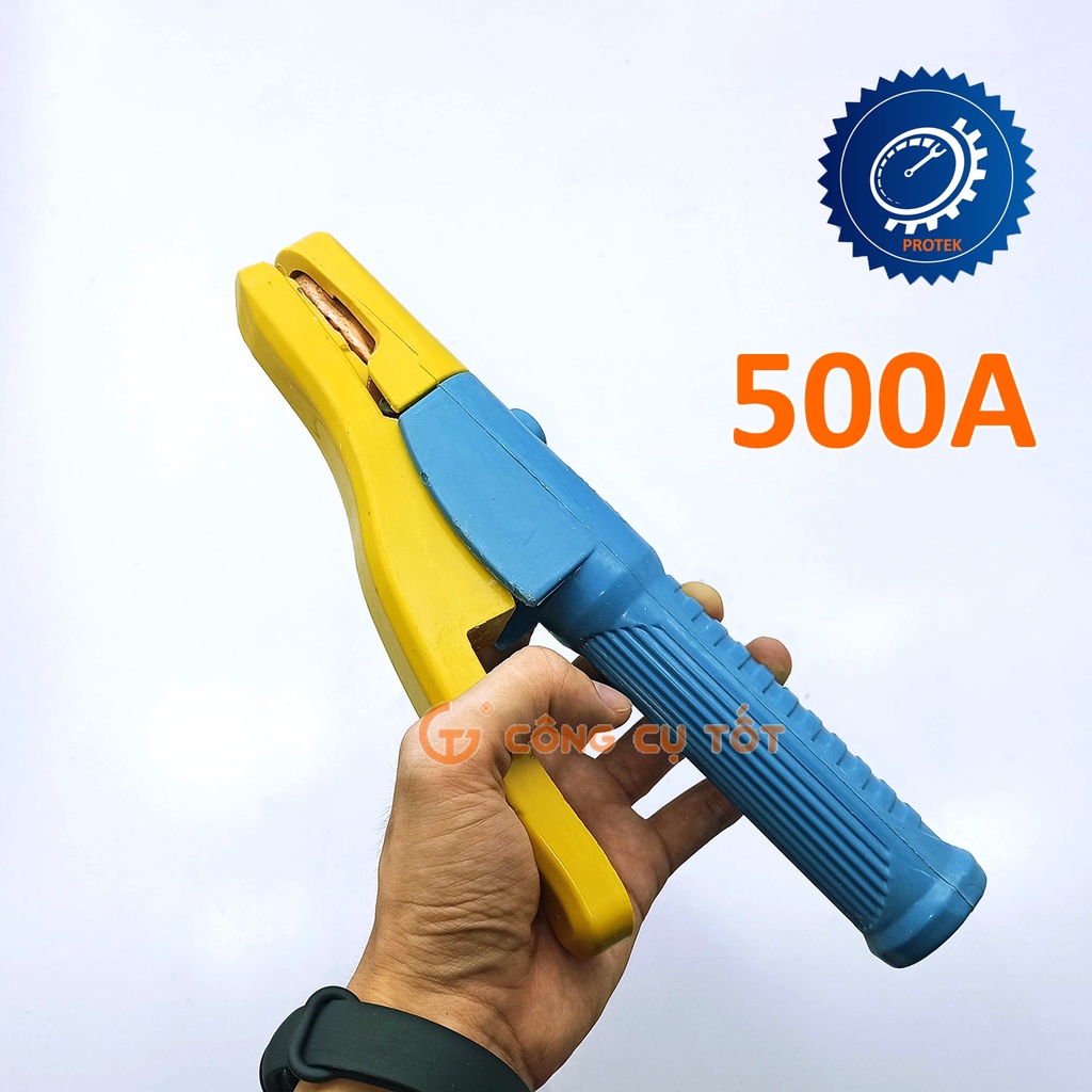Kìm hàn điện 500Ampe Protek cán nhựa xanh dương có má kẹp làm từ đồng đỏ nguyên chất dẫn điện, dẫn nhiệt tốt. Sản phẩm vừa có tác dụng giữ chặt que hàn và cung cấp dòng điện khi hàn. Đây là dụng cụ cầm tay không thể thiếu của mỗi người thợ hàn.Cường độ dòng điện: 500A