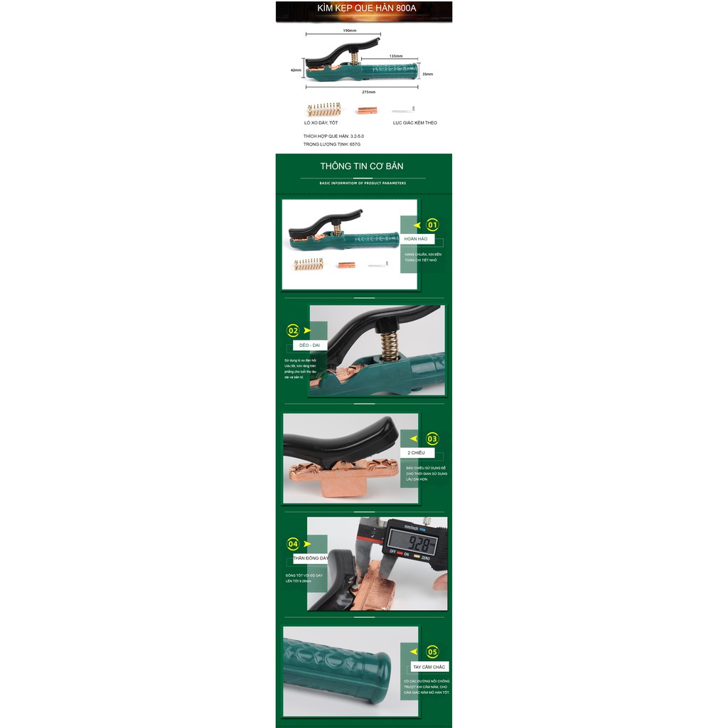 Chất liệu: Thân đồng; Năng lực hiện tại 800 (A); Đường kính cáp hỗ trợ tối đa 8 (mm); Đường kính điện cực kẹp tối đa 3,2-5,0 (mm)