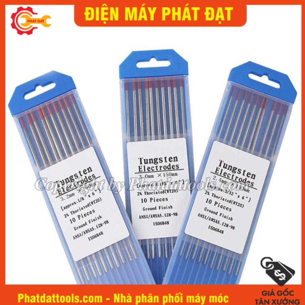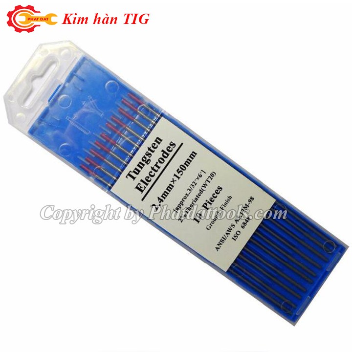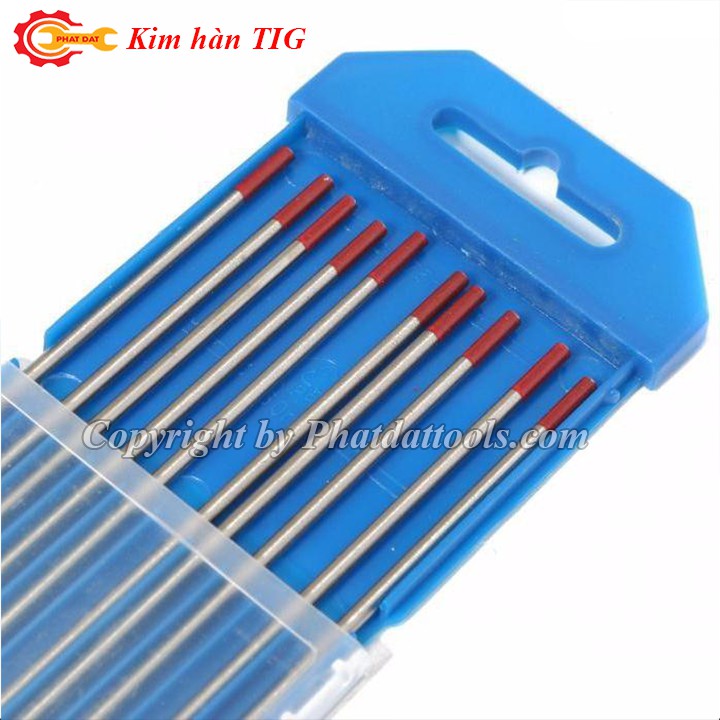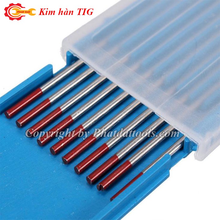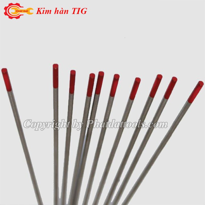 Kim hàn TIG-Điện cực TUNGSTEN là phụ kiện chuyên dụng cho máy hàn TIG hay còn gọi là máy hàn inox,máy hàn khí Argon.được cấu tạo chủ yếu từ vonfram do ưu điểm độ cứng cũng như khả năng chịu được nhiệt độ cao. Điện cực kim hàn Tig có thể cấu tạo từ thuần vonfram hoặc kết hợp với một số kim loại hoặc oxit đất hiếm.Kim hàn TIG-Điện cực TUNGSTEN này chứa tối thiểu 97.3% vonfram và khoảng 1.7% đến 2.2% Thori. Chúng được sử dụng nhiều nhất trong các loại kim hàn Tig hiện nay vì sử dụng dễ dàng cũng như có tuổi thọ cao.