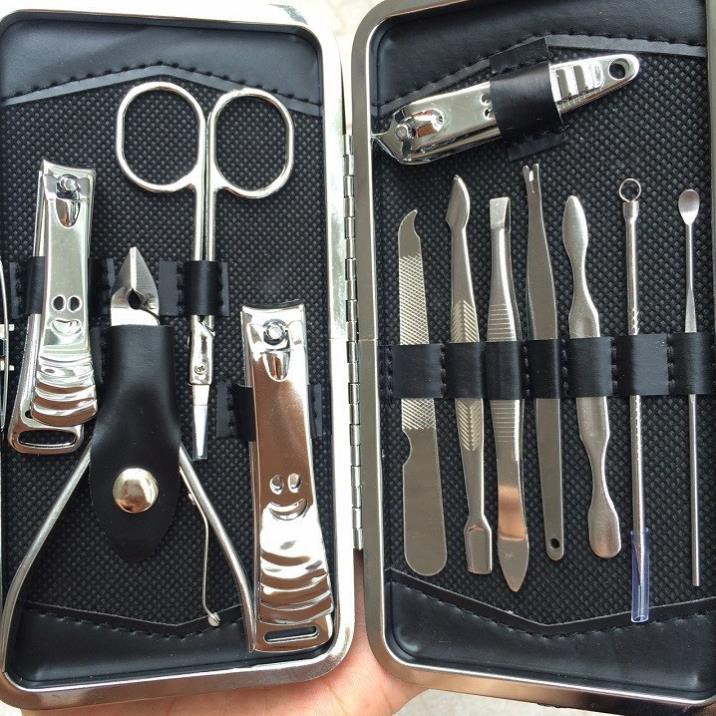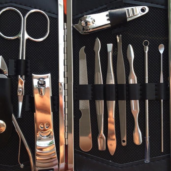 - Bộ sản phẩm gồm 12 món: 3 đồ bấm móng tay lớn + vừa + nhỏ, kéo cắt lông mũi, kềm cắt da, cây nặn mụn, 1 cây móc tai, 1 dũa, 1 nhíp, 2 cây lấy khóe, 1 dụng cụ làm sạch móng.