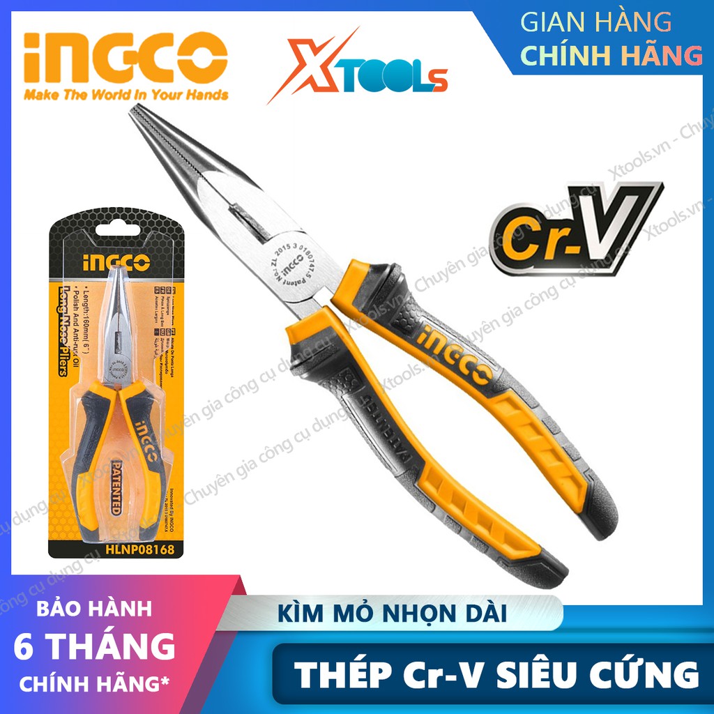 Giới thiệu Kìm mỏ nhọn dài cách điện INGCO HLNP08168 6" kềm mỏ dài thép Cr-V siêu cứng chống rỉ sét tay cầm cao su chống trơn trượt