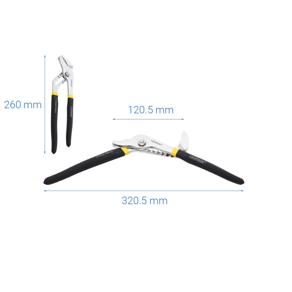 • Mũi kìm được làm từ Thép Carbon chất lượng cao HRC 42-48.• 6 Lỗ, dài 260mm, độ mở tối đa 120.5 mm cán dày bọc nhựa PVC 120mm.