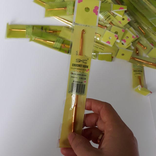 Kim móc 2 đầu cán vàng hiệu SKC. Dòng kim phù hợp cho các bạn bắt đầu tập móc, với giá thành rẻ, chất lượng ổn.Có các size: