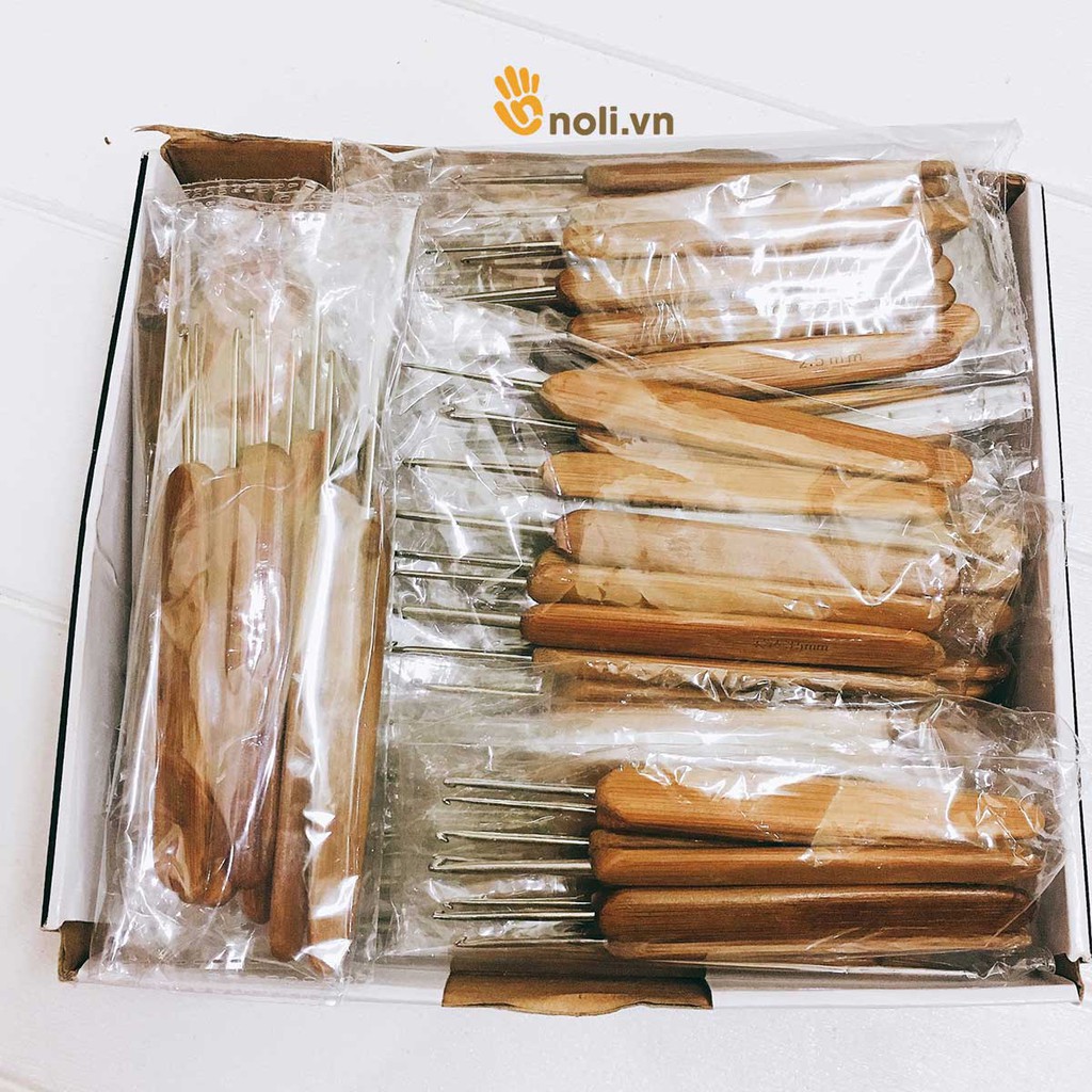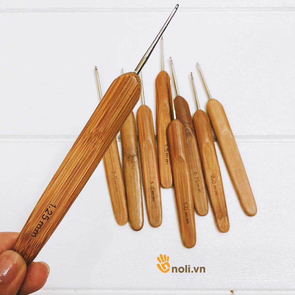 Bộ kim móc cán gỗ 10 câyBộ kim móc cán gỗ có 10 cây chạy size từ: 0.5mm - 0.75mm - 1.0mm - 1.25mm - 1.5mm - 1.75mm - 2.0mm - 2.25mm - 2.5mm - 2.75mm