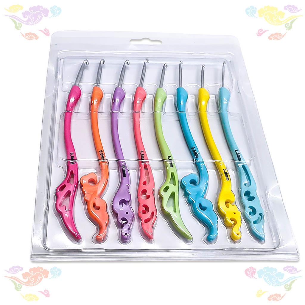 Kim móc có phần cán được làm bằng nhựa dẻo họa tiết sóng biển vô cùng đôc đáo, chắc chắn, màu sắc tinh tế sẽ là sự lựa chọn thích hợp cho các tín đồ đan móc vì giá cả phải chăng, độ bền cao.- Bộ gồm 8 size kim khác nhau: 2.5mm; 3mm; 3.5mm; 4mm; 4.5mm; 5mm; 5.5mm; 6mm