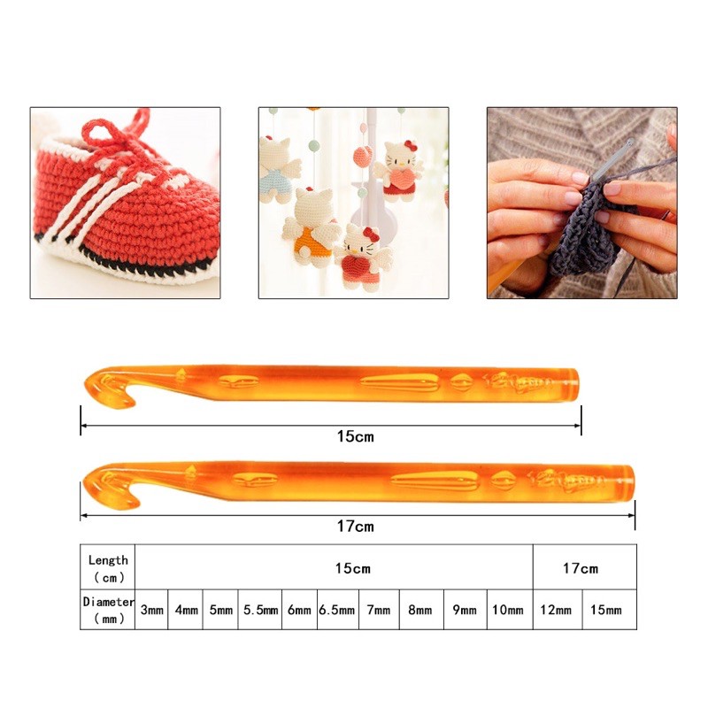 Là loại kim móc được làm bằng chất liệu nhựa trong suốt, móc rất êm và mượt. Đồng thời với kích thước size lớn nên sẽ là sự lựa chọn hoàn hảo cho việc sử dụng móc các loại sợi với kích cỡ lớn- Từ size 3mm đến 10mm: Chiều dài kim là 15cm