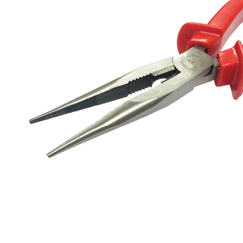 Kìm Nhọn cán Đỏ hiệu TOP, được sản xuất tại Đài Loan. Với thiết kế mũi kìm nhọn và dài, sản phẩm này phù hợp sử dụng tại các vị trí nhỏ hẹp hoặc nằm sâu bên trong chi tiết.Đầu kìm được chế tạo từ thép tốt, và được xử lý nhiệt đặc biệt, nhằm gia tăng độ cứng cho đầu và lưỡi cắt của kìm.