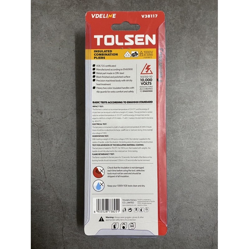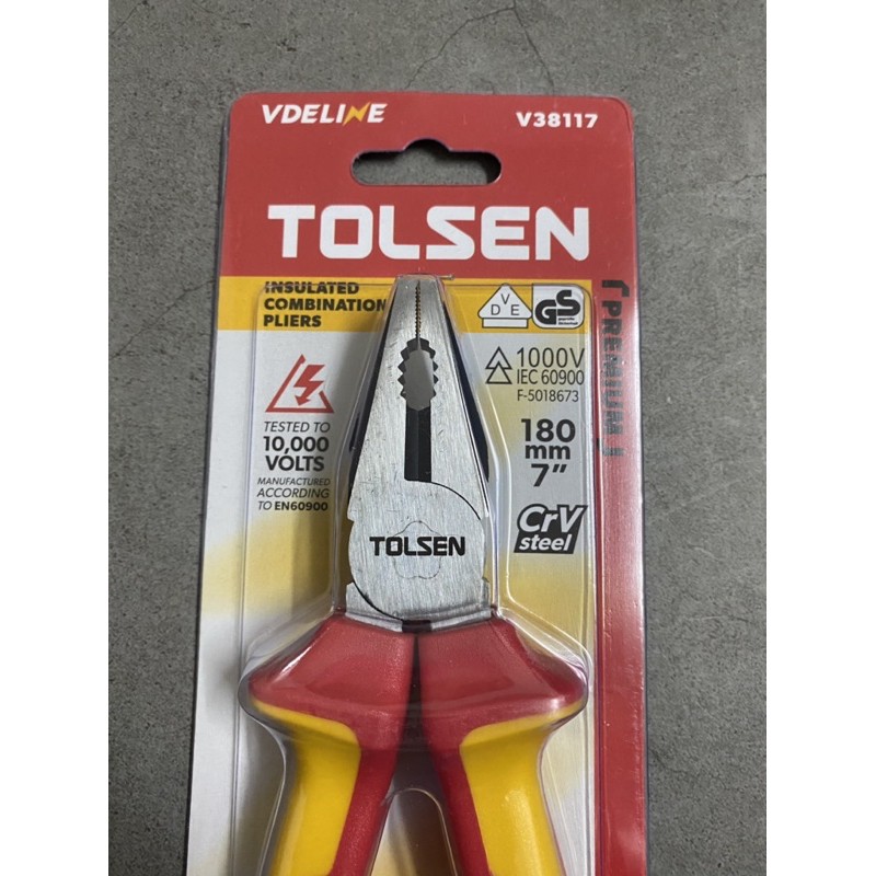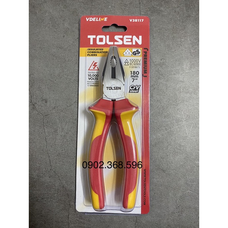 Kềm răng cách điện 1000V loại 7 inch Tolsen V38117• Size 7"/180mm, thép CRV đánh bóng đen• Tay cầm bọc nhựa chuyên dụng cách điện 1000V