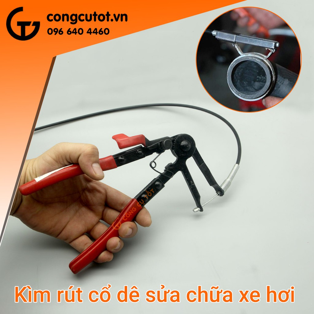 Kìm rút cổ dê xe hơi là sản phẩm giúp ta siết chặt cổ dê hay còn gọi là đai siết thích hợp cho việc giữ chặt các ống mềm với các đầu ống, đầu dẫn kim loại của máy móc...Kìm được làm từ thép hợp kim cao cấp chống gỉ. Đầu kìm có cáp kéo để có thể luồn lách vào những nơi kẹp để kéo rút cổ dê. Siết chặt cố định các đường ống dẫn mềm với các chi tiết máy kim loại. Kìm có chốt định cữ giúp ta siết đai với lực như mong muốn. Tay cầm được bọc cao su cách điện. Sử dụng dễ dàng, không phải mất nhiều sức lực để siết đaiĐặc điểm nổi bật: