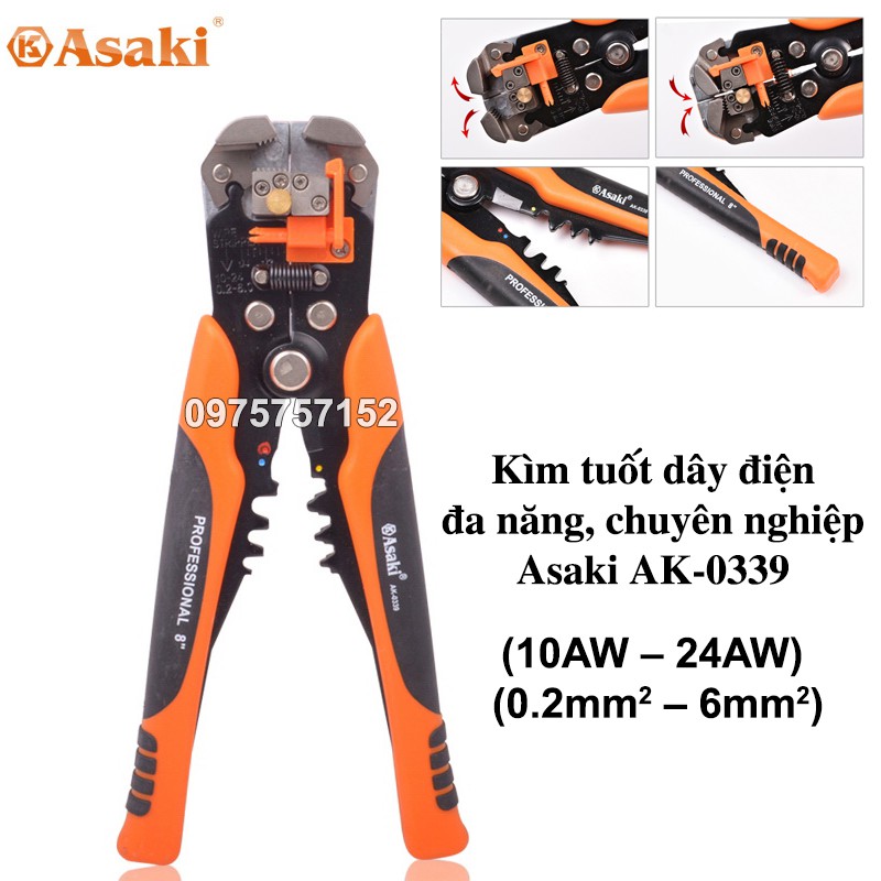 Kìm tuốt dây điện, bấm cos đa năng, tự động Asaki AK-0339 (10AW – 24AW) (0.2mm2 – 6mm2)