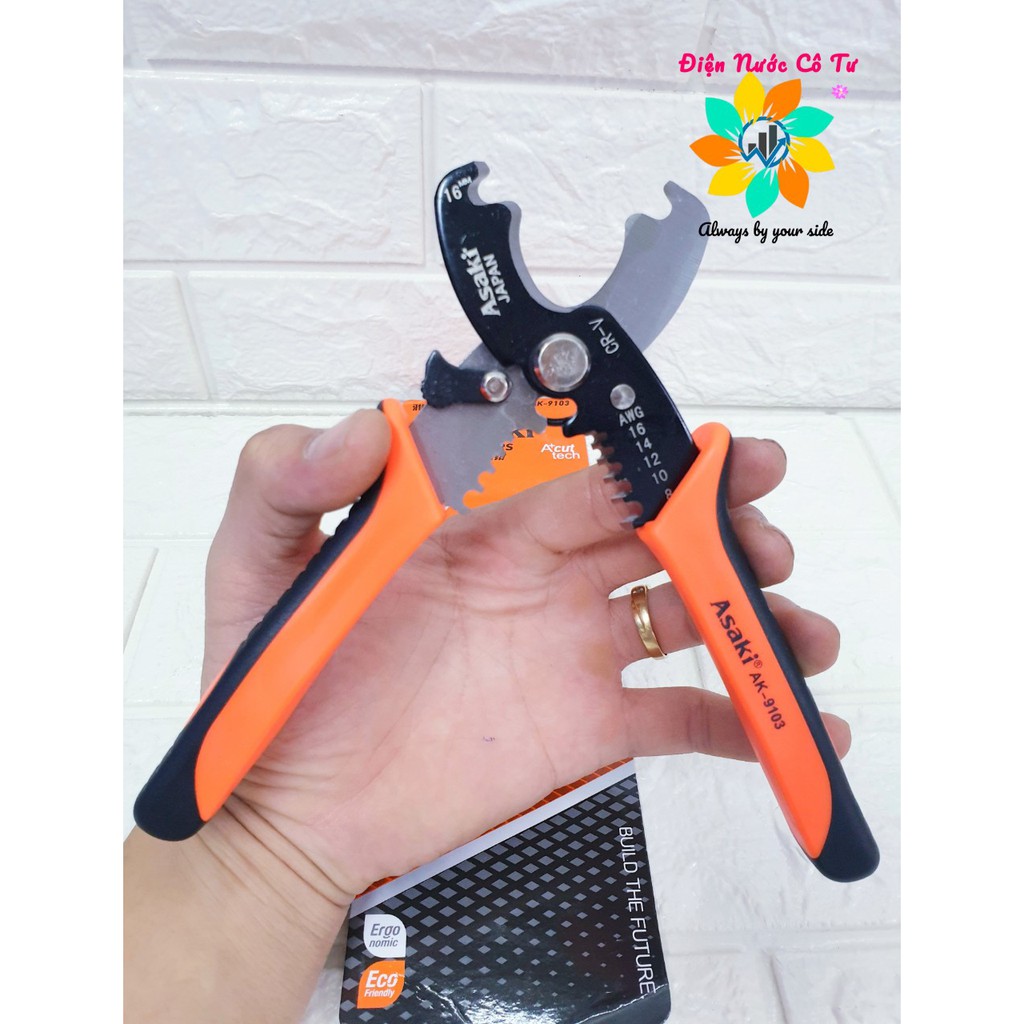 Kìm tuốt dây điện đa năng đầu cắt dây điện dây cáp Asaki AK - 9103Kìm tuốt dây điện là một trong những "bảo bối" hay được sử dụng bởi các thợ điện và truyền hình cáp. Kìm tuốt dây điện dễ sử dụng, được nhà sản xuất chú trọng vào tính năng an toàn và cảm giác thoải mái khi sử dụng. Được gia công tỉ mỉ và làm từ nguyên liệu cao cấp nên khó bị cong vênh, gỉ sét. Phần đầu của kìm được làm từ hợp kim thép cao cấp. Kìm Asaki AK-9103 thường được dùng để tuốt phần vỏ dây nhanh mà không cần dùng kéo hay đốt lửa. Kìm thường được dùng để tuốt dây điện rất hiệu quả. Bạn chỉ việc đưa dây điện vào họng kìm tương ứng với kích thước của lõi dây điện, bấm xong kéo ra là xong, nhanh gọn, không mất thời gian và sức lực!
