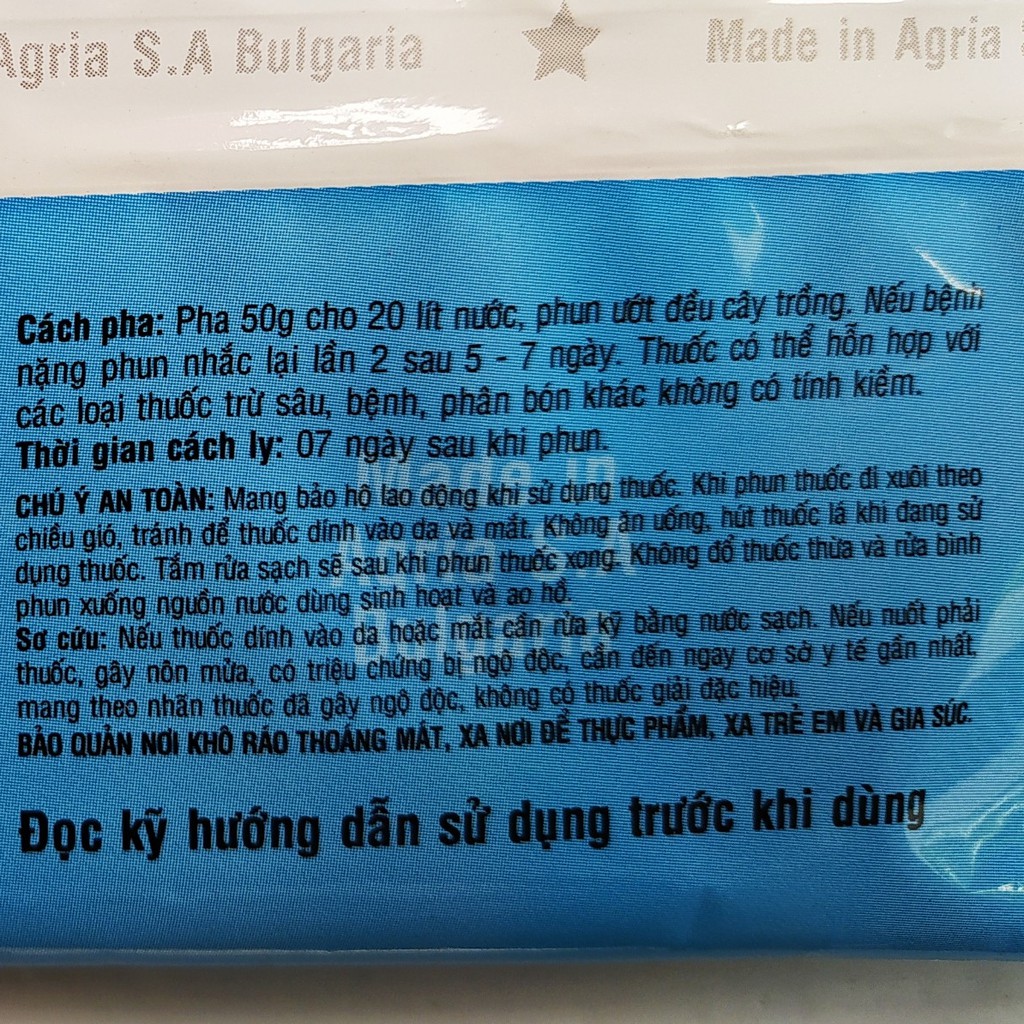Pha 50G cho 20 lít nước, phun ướt đều cây trồng, nếu bệnh nặng thì phun lại lần 2 sau 5-7 ngày.