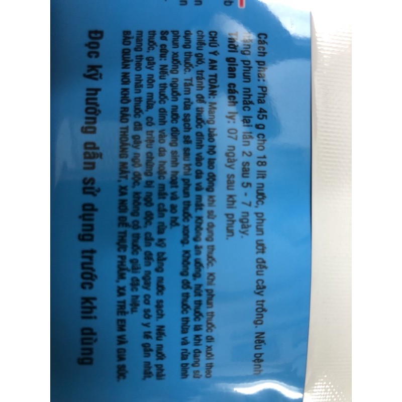 Dùng 100g cho 40-60 lít nước 7 đến 10 ngày 1 lần vào sáng sớm hoặc chiều tối.bệnh nặng thì xịt cách lần 2 từ 3 đến 5 ngày. xịt sau 1h gặp mưa sẽ không bị trôi đọng lại dung dịch màu xanh giúp cho thân lá hấp thụ từ từ để phòng và trị bệnh rất hiệu quả...