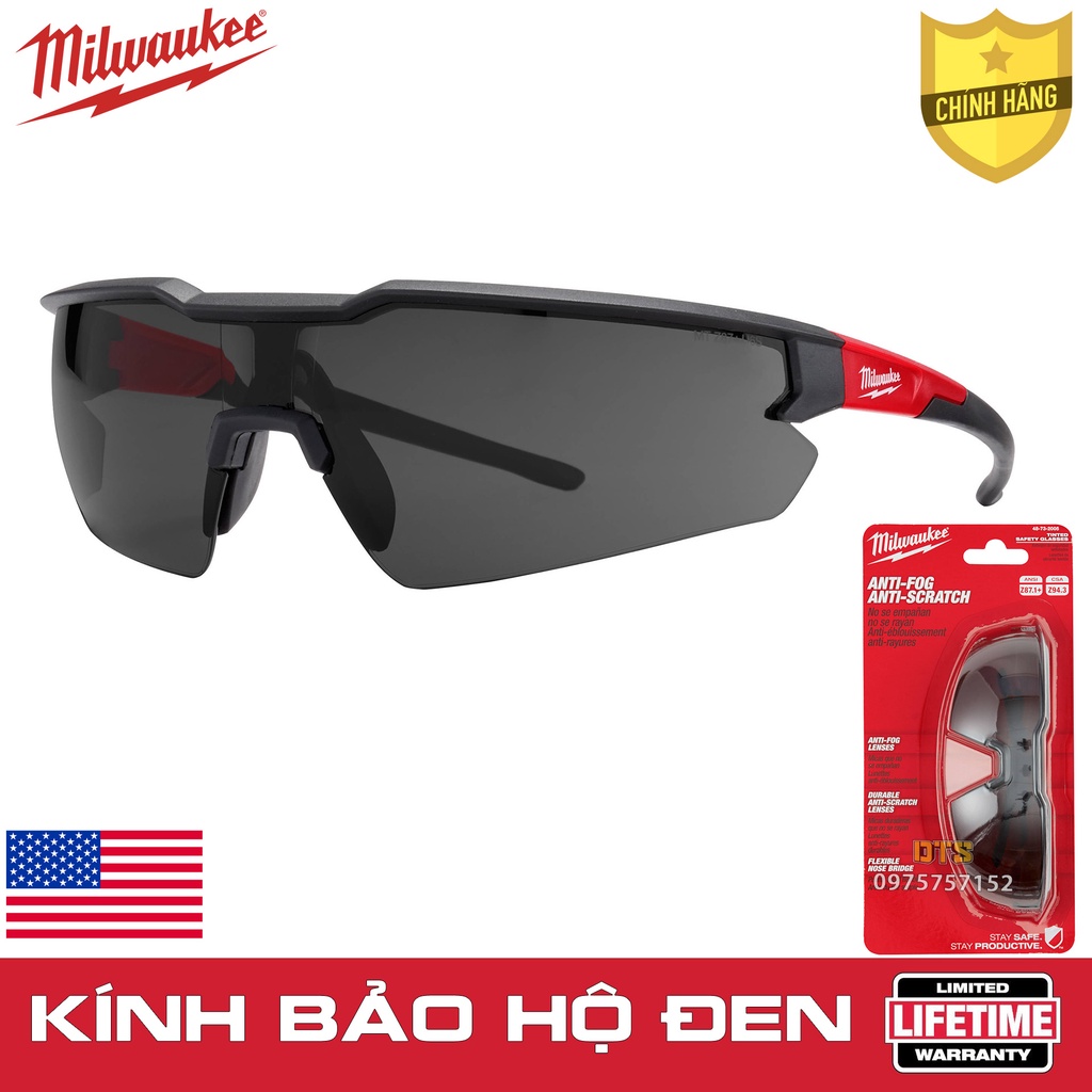 Kính bảo hộ đen Milwaukee Mỹ kính chống bụi, chống hơi nước trầy xước vượt trội, ngăn chặn tia UV, mắt kính đi xe máy