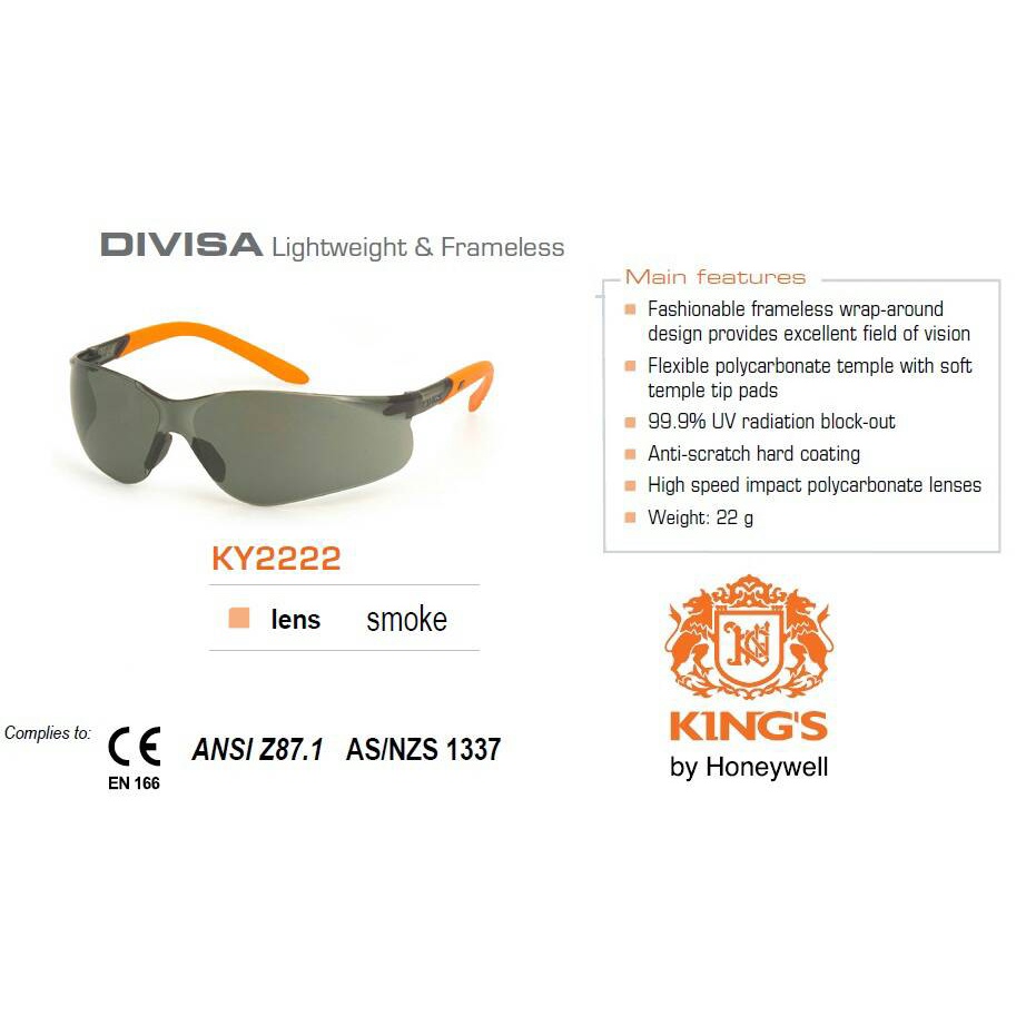 Kính bảo hộ KY2222 thương hiệu KINGS được làm bằng polycarbonate chống va đập, chống vỡ vụn với khả năng chặn đến 99% tia cực tím gây hại cho mắt. Ngoài ra, mặt kính được phủ thêm một lớp chống hơi sương và đạt chứng nhận ANSI Z87.1.