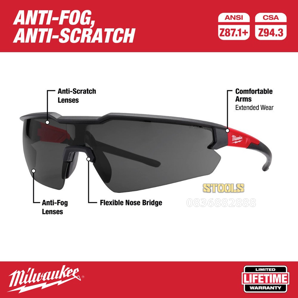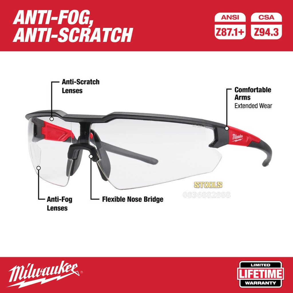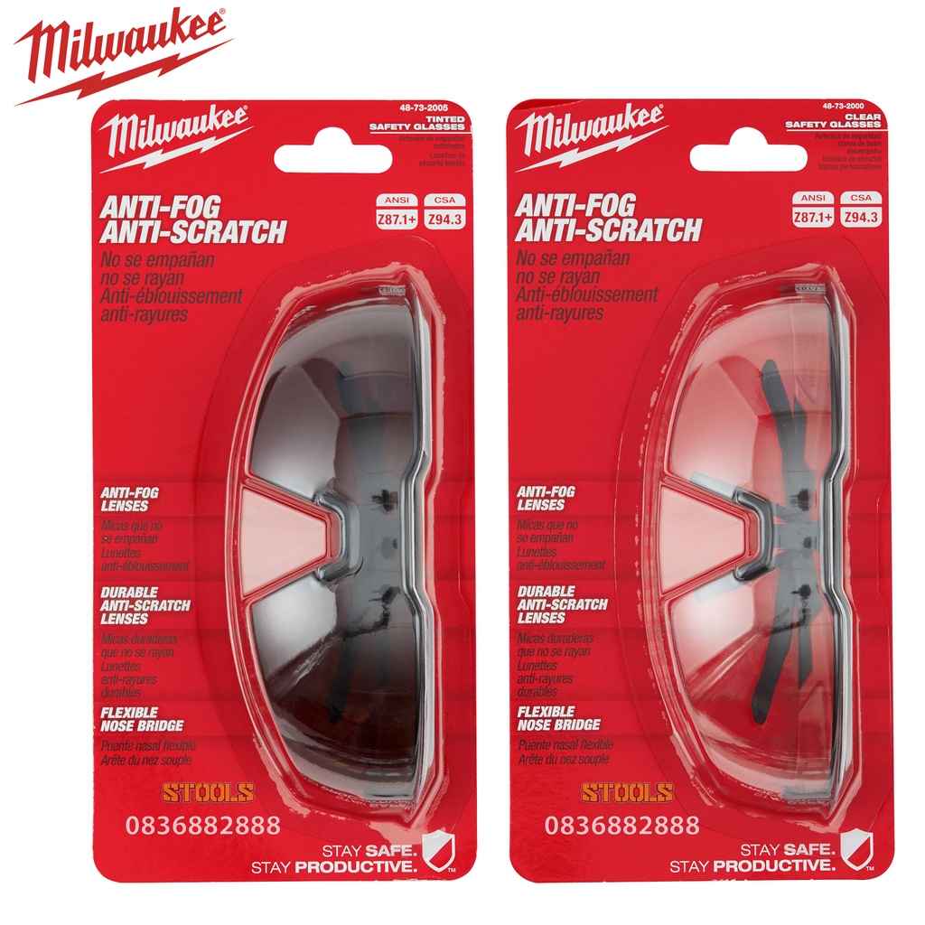- Kính Milwaukee còn phủ một lớp chống sương mù, lớp phủ này tồn tại lâu hơn so với lớp phủ chống đọng sương truyền thống. Giúp người dùng cải thiện được tầm nhìn, tăng hiệu suất làm việc trong môi trường ẩm ướt và sương mù.
