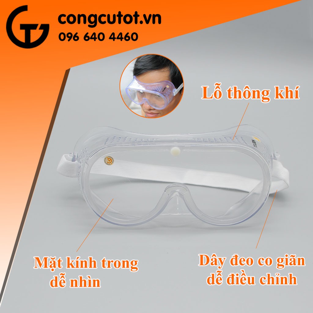 -Vòm kính rộng, ôm trọn mắt tránh những tác nhân xấu khi làm, đồng thời kính có thiết kế thông minh khi có những lỗ thông hơi, khí nên khi sử dụng sẽ không bị mờ