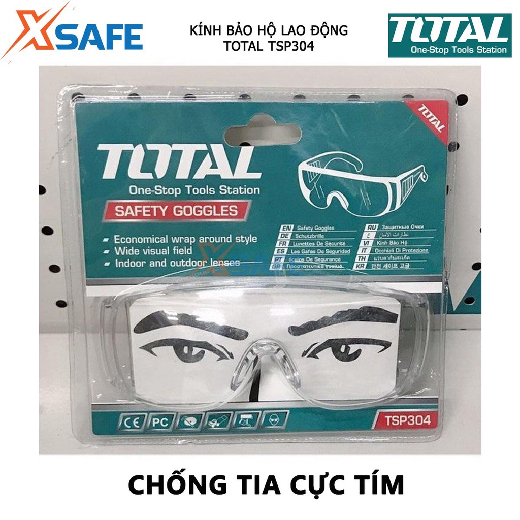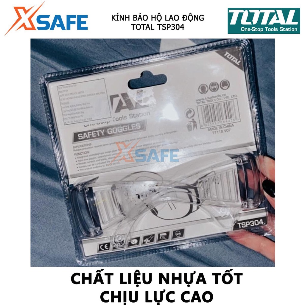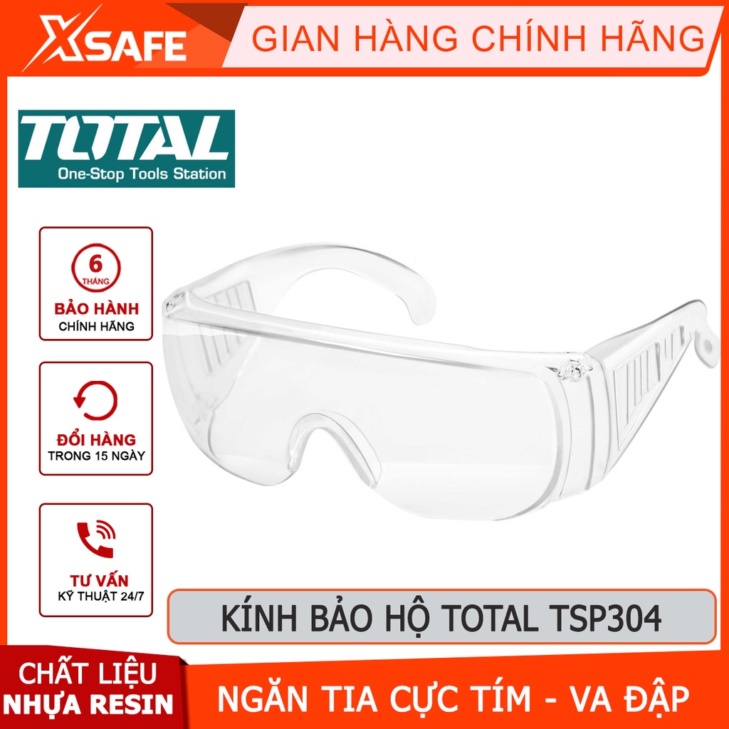 -Sản phẩm có khả năng chống lại tia cực tím đến 99.9% và ngăn cho mắt không tiếp xúc với nước và chống tích tụ hơi sương. Kính bảo hộ Total TSP304 là một sản phẩm giúp bảo vệ đôi mắt của người dùng, không cho các vật lạ bay vào như trong quá trình thực hiện việc sửa chữa, vận hành các máy móc hay thường xuyên cắt mài các vật liệu kim loại bắn ra những mảnh, tia sáng.