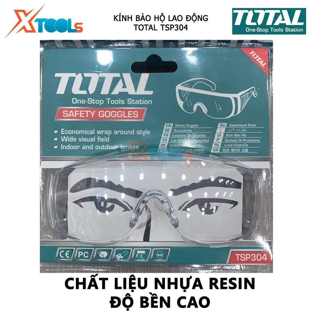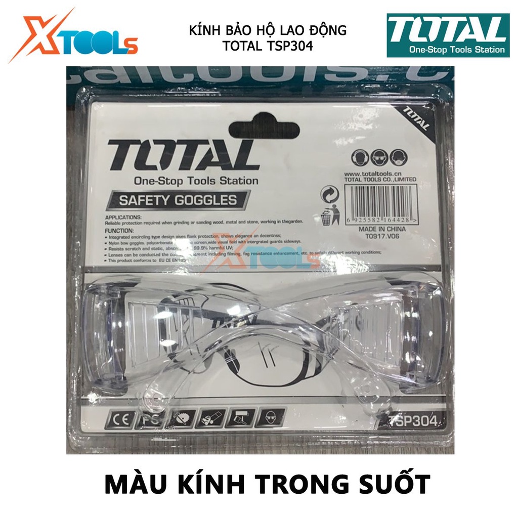 - Sản phẩm có khả năng chống lại tia cực tím đến 99.9% và ngăn cho mắt không tiếp xúc với nước và chống tích tụ hơi sương. Kính bảo hộ Total TSP304 là một sản phẩm giúp bảo vệ đôi mắt của người dùng, không cho các vật lạ bay vào như trong quá trình thực hiện việc sửa chữa, vận hành các máy móc hay thường xuyên cắt mài các vật liệu kim loại bắn ra những mảnh, tia sáng.