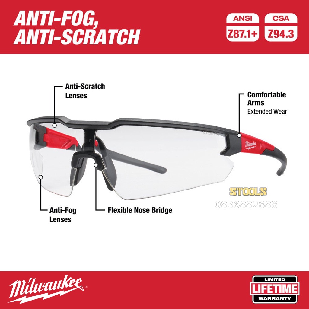 - Kính Milwaukee còn phủ một lớp chống sương mù, lớp phủ này tồn tại lâu hơn so với lớp phủ chống đọng sương truyền thống. Giúp người dùng cải thiện được tầm nhìn, tăng hiệu suất làm việc trong môi trường ẩm ướt và sương mù.