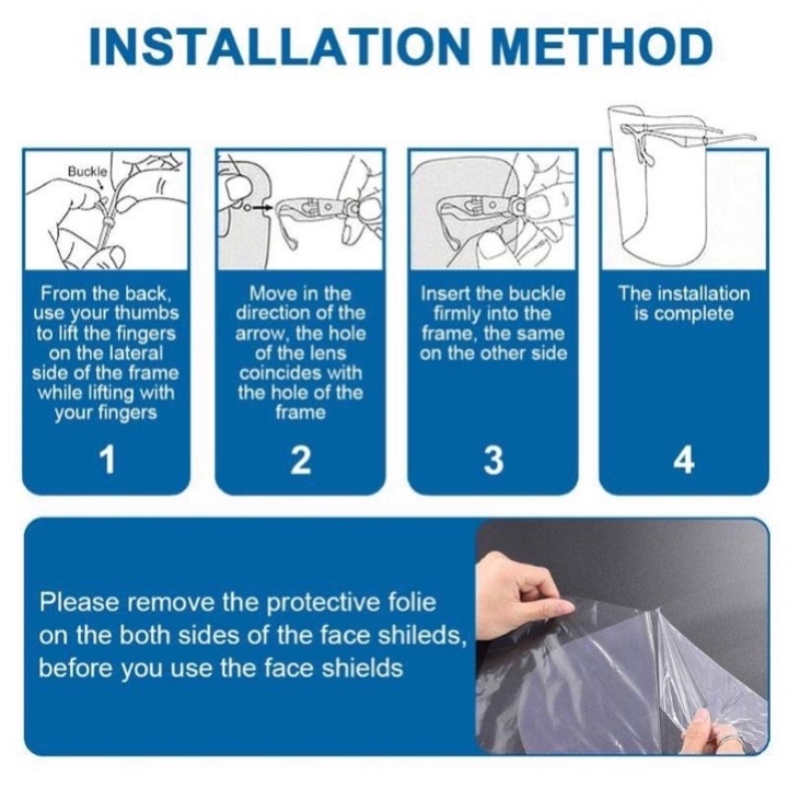 - Trước khi sử dụng kính bảo hộ trong suốt người dùng cần bóc bỏ lớp nilon bảo vệ được dán ở 2 mặt của tấm kính.