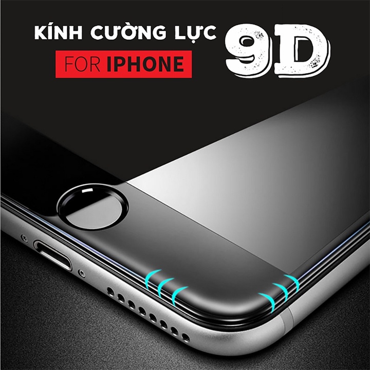 - Kính cường lực 9D full màn cho iPhone có độ cứng đạt chuẩn 9H bảo vệ an toàn cho màn hình iPhone tốt hơn gấp 5 lần các loại kính cường lực thế hệ cũ.