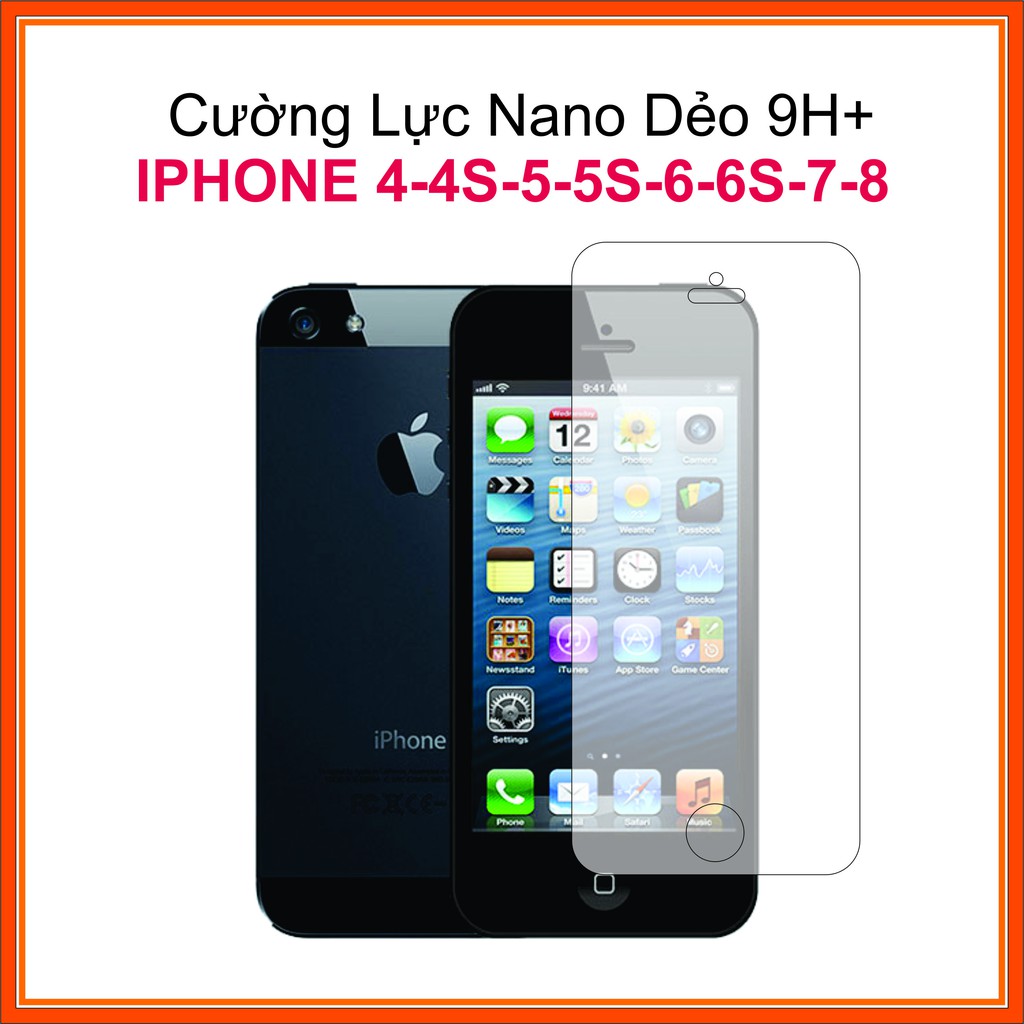 Kính Cường lực mặt trước, sau cho iPhone 4, 4s, 5, 5s, 6, 6s, 7, 8 Cường lực Nano Dẻo 9H+