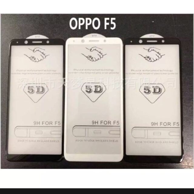 Kính Full Màn Hình Oppo F5 có 2 màu đen và trắng. Miếng dán kính cường lực full toàn bộ màn hình điện thoại OPPO F5 (loại 5D)Miếng dán với độ cứng 9H (cứng gấp 20 lần so với miếng dán thông thường) giúp bảo vệ mặt màn hình tránh bị trầy xước cũng như nứt vỡ trong quá trình sử dụng--------------------------------------------------------------------------