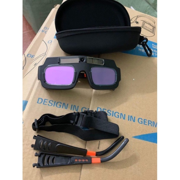 Kính hàn tự động 2 mắt kính là phụ kiện máy hàn không thể thiếu của thợ cơ khí, sửa chữa cổng sắt,... có hộp chống sóc giảm thiểu hư hại cho kính