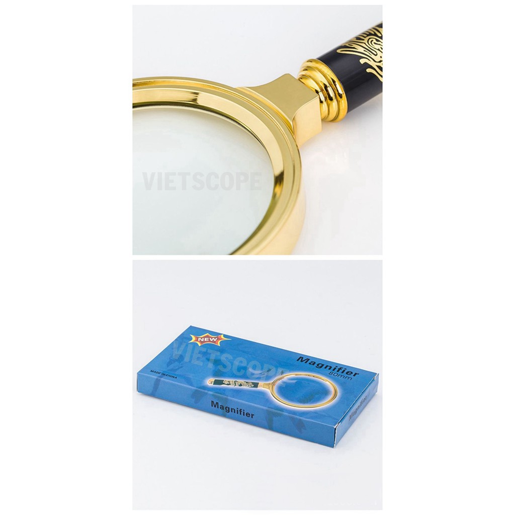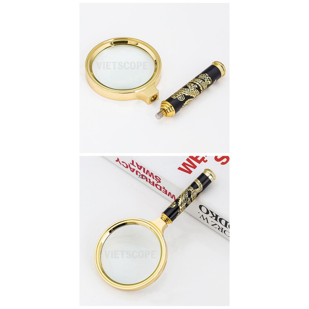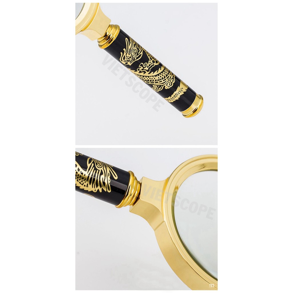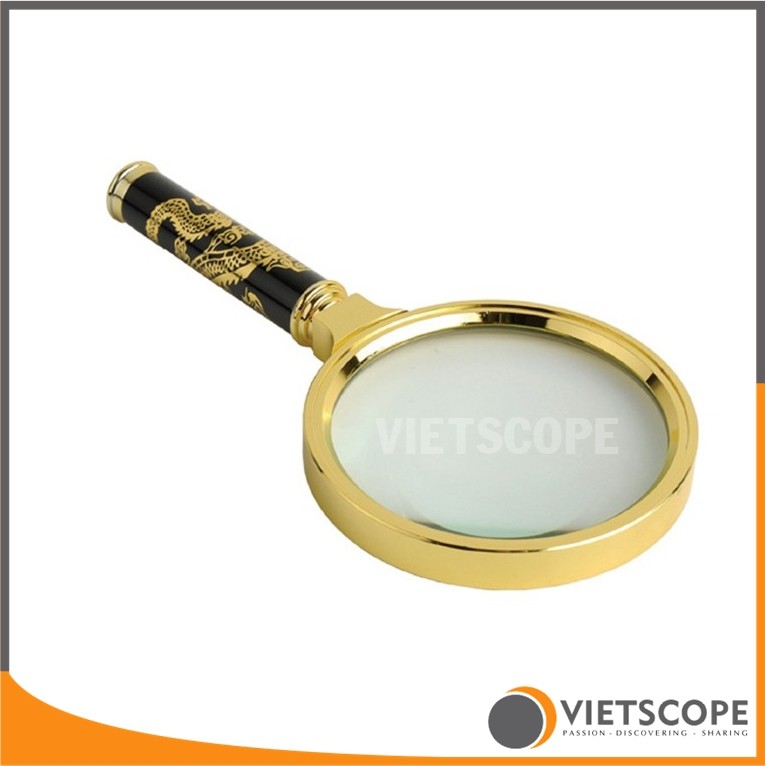 Kính lúp có vẻ ngoài trông cực kì bắt mắt với đường kính từ 60-90 mm, tay cầm chắc chắn, được thiết kế bộ phận giữ phần kính độc đáo và sáng loáng với màu vàng kim. Ngoài chức năng soi thông thường, kính lúp cầm tay khắc hoa văn rồng còn có tác dụng trang trí rất đẹp và sang trọng trên bàn làm việc, kệ sách ...Đường kính : nhiều cỡ 60 - 90 mm