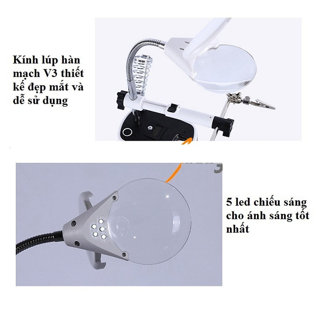 Kính lúp hàn mạch là một loại kính lúp được thiết kế chuyên dụng hỗ trợ hàn mạch in, mạch điện tử có kích thước nhỏ. Với đèn led chiếu sáng, 2 tay kẹp mạch và ống lò xo để mỏ hàn tiện lợi sẽ giúp bạn rất nhiều trong công việc sửa chữa, chế tạo mạch in điện tử.