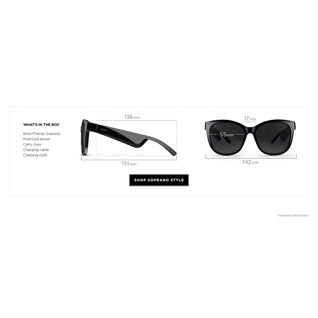 Từng được bình chọn là Những phát minh tốt nhất năm 2019 của tạp chí Time, kính mát nghe nhạc Bose Frames thế hệ trước đã làm chấn động người tiêu dùng một thời. Đến nay sự xuất hiện của kính Bose Frames Soprano với những cải tiến mới, tinh chỉnh tinh tế và vô cùng thanh lịch, trang bị thấu kính phân cực và kỹ thuật thủ công cao cấp, cùng công nghệ độc quyền của Bose Open Ear Audio ™ mang đến cho bạn trải nghiệm âm thanh trên một chiếc kính mát thời trang vô cùng độc đáo.Vẫn giữ nét cổ điển giống như Bose Frames thế hệ cũ, tuy nhiên trên phiên bản Soprano được tinh chỉnh với thấu kính lớn và đường viền chân mày dốc khéo léo tạo nên nét quyến rũ trong một bản cập nhật trang nhã cho kính mắt mèo.